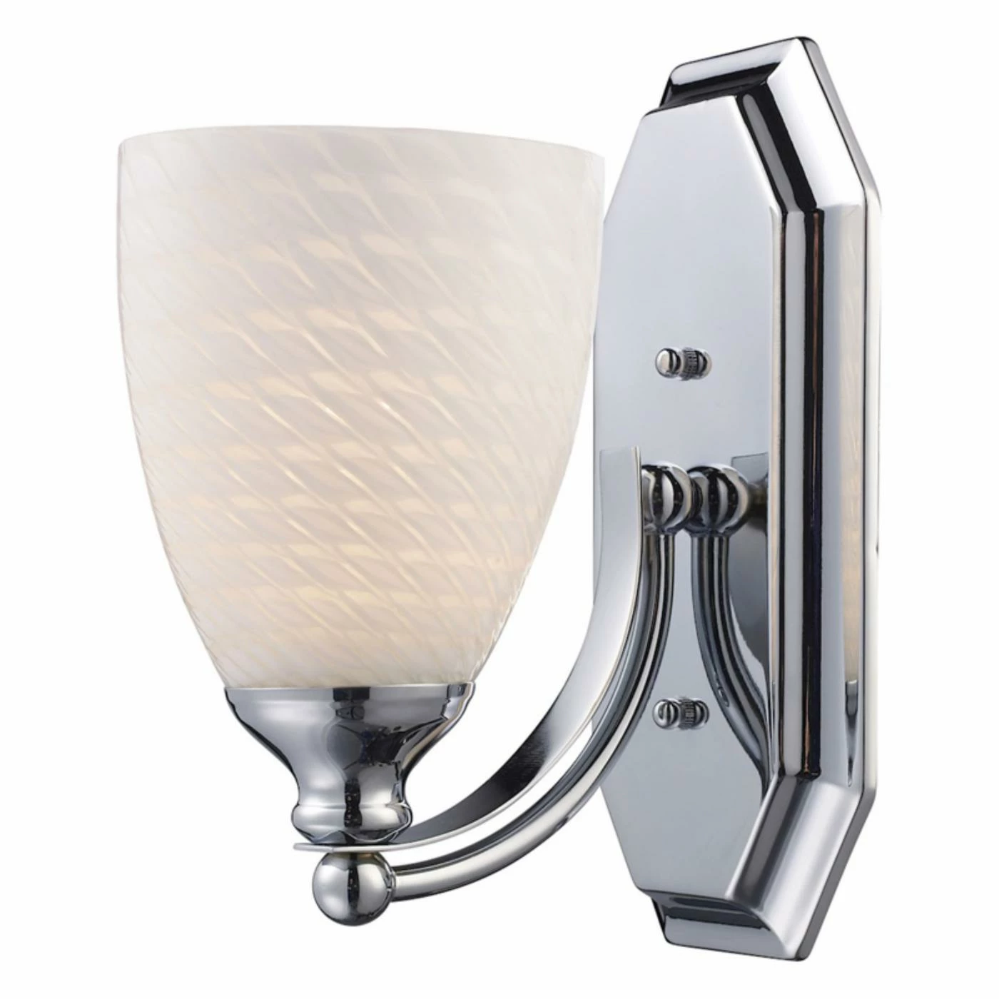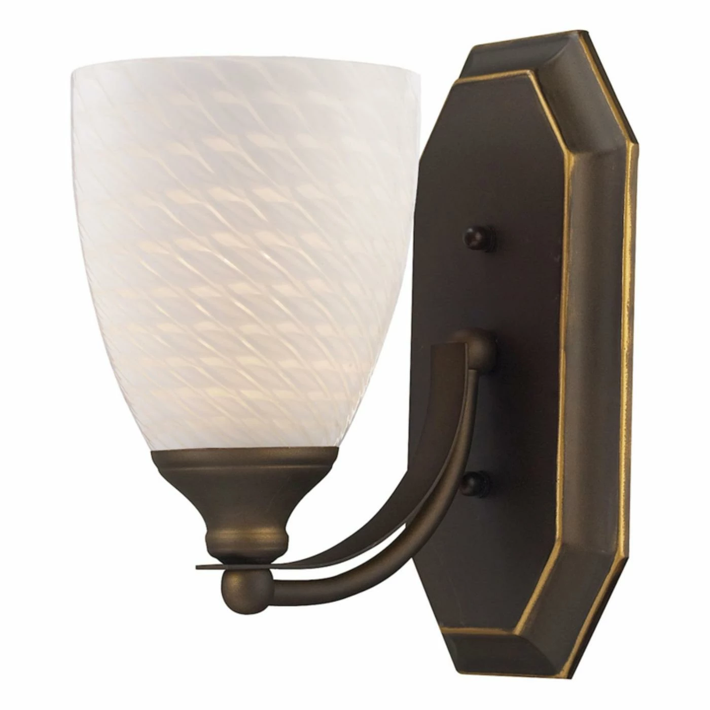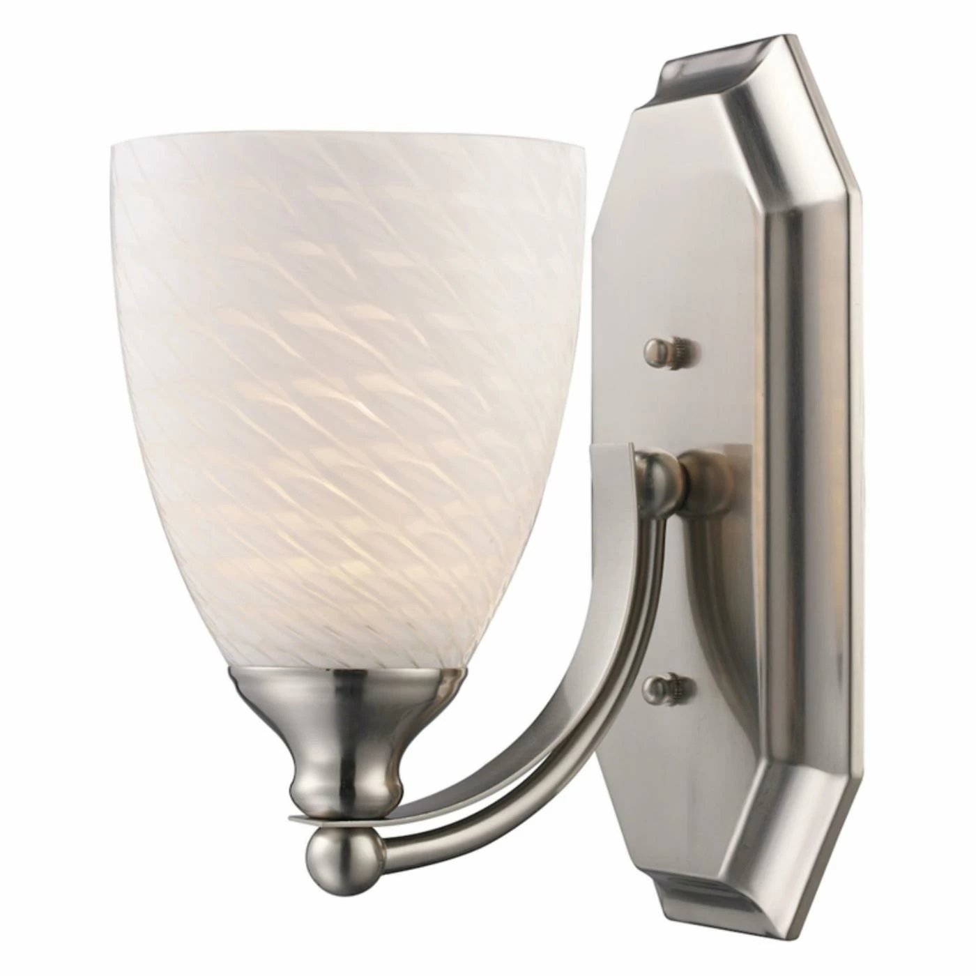 Add a bit of elegance with a modern twist with the Elk Lighting Bath and Spa 570-1 Bathroom Vanity Light with White Swirl Glass. Its detailed metalwork fixture comes in your choice of finish. An swirled white glass shade completes the contemporary look. This bathroom vanity light is offered in your choice of available bulb configuration. Your choice dictates whether the bulb is included or not.