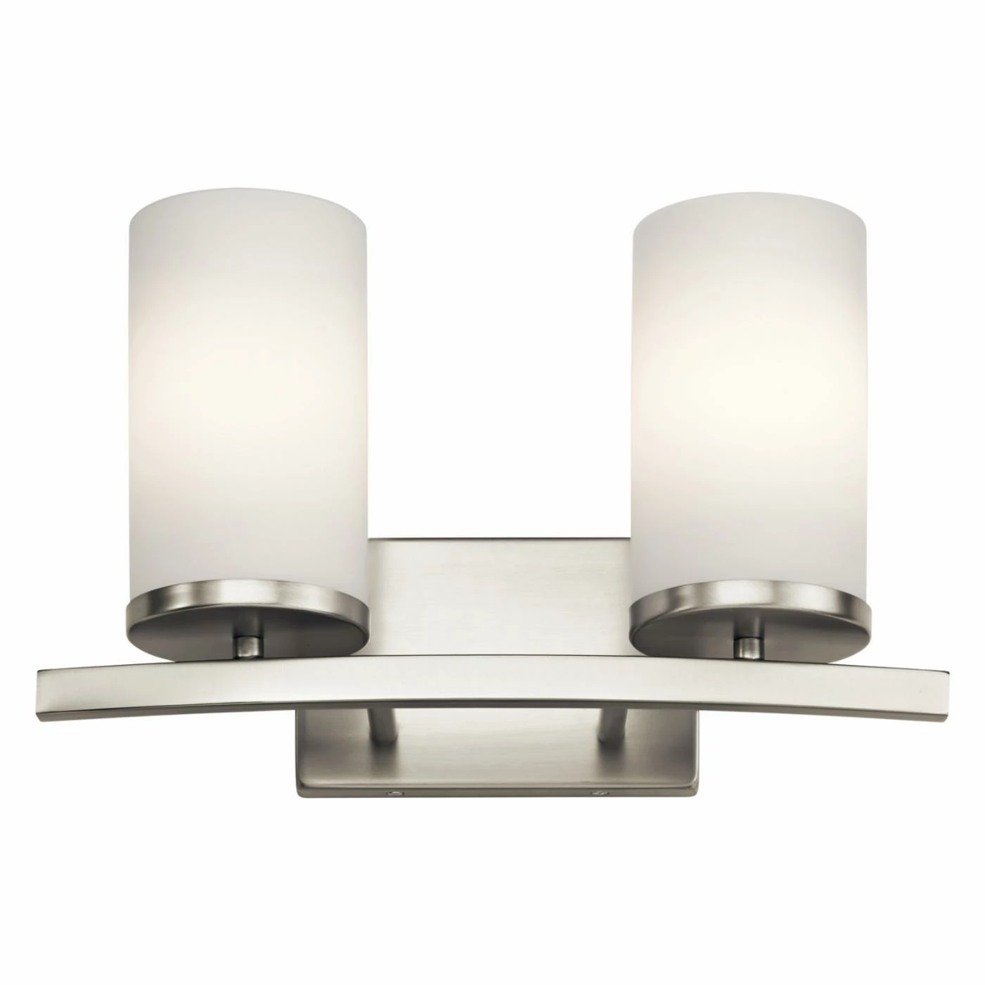 Showcasing clean, simple lines, the Kichler Crosby 45496 Bath Light adds elegance to the look of modern bathrooms. Its two up lights provide ambient illumination that is softened by the included satin etched, opal glass cylinder shades. Offered in your choice of available finishes, the fixture is fabricated out of steel and includes round pedestals, a curved bar arm, and a rectangular backplate.