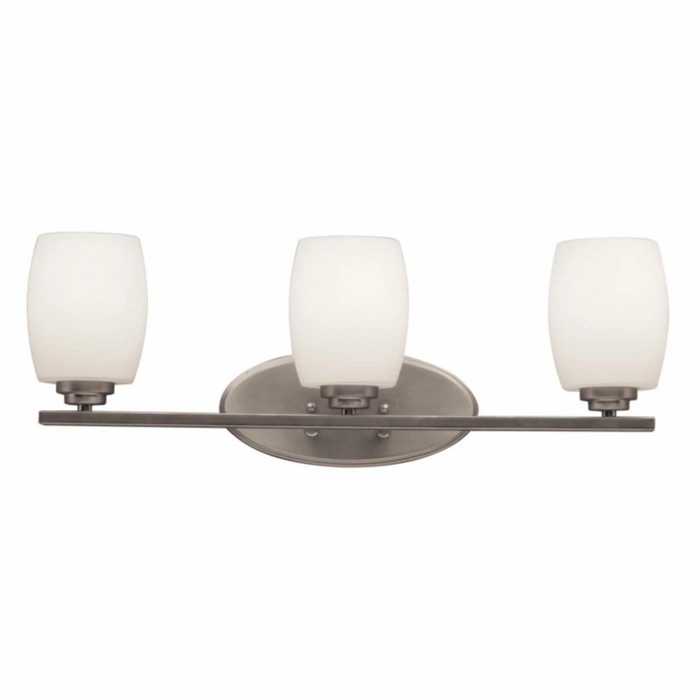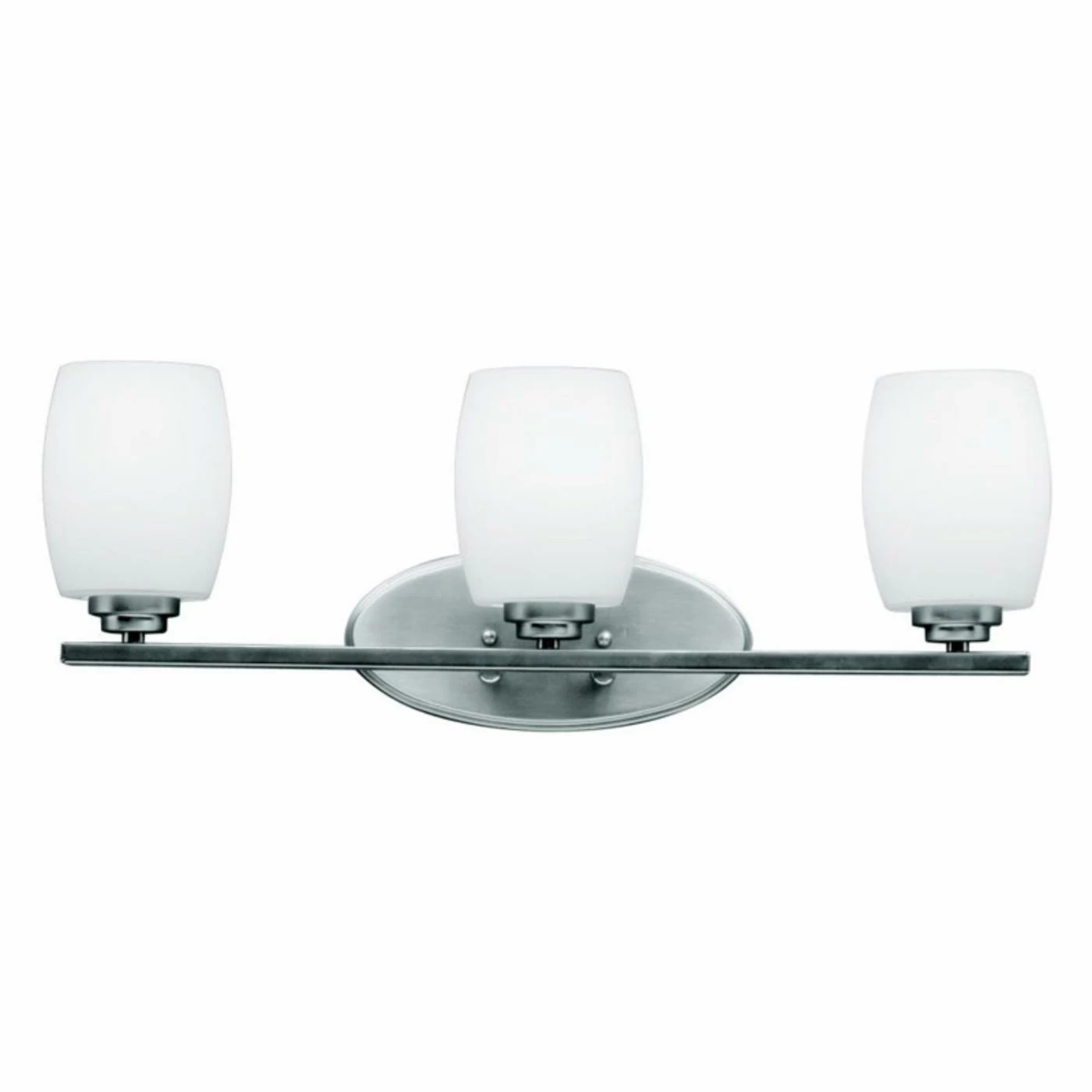 Infuse grace and elegance in your private space using the Kichler Eileen 5098 Vanity – 24 in. This three-lamp light fixture provides generous illumination in bath and powder room. Mount it directly over sinks and vanities to provide task lighting. Its modern design enhances the decor of bathrooms in contemporary homes. Vanity light accessory gives elucidation and decoration to your living space. The cylindrical satin etched glass lamps give out soft, warm light.