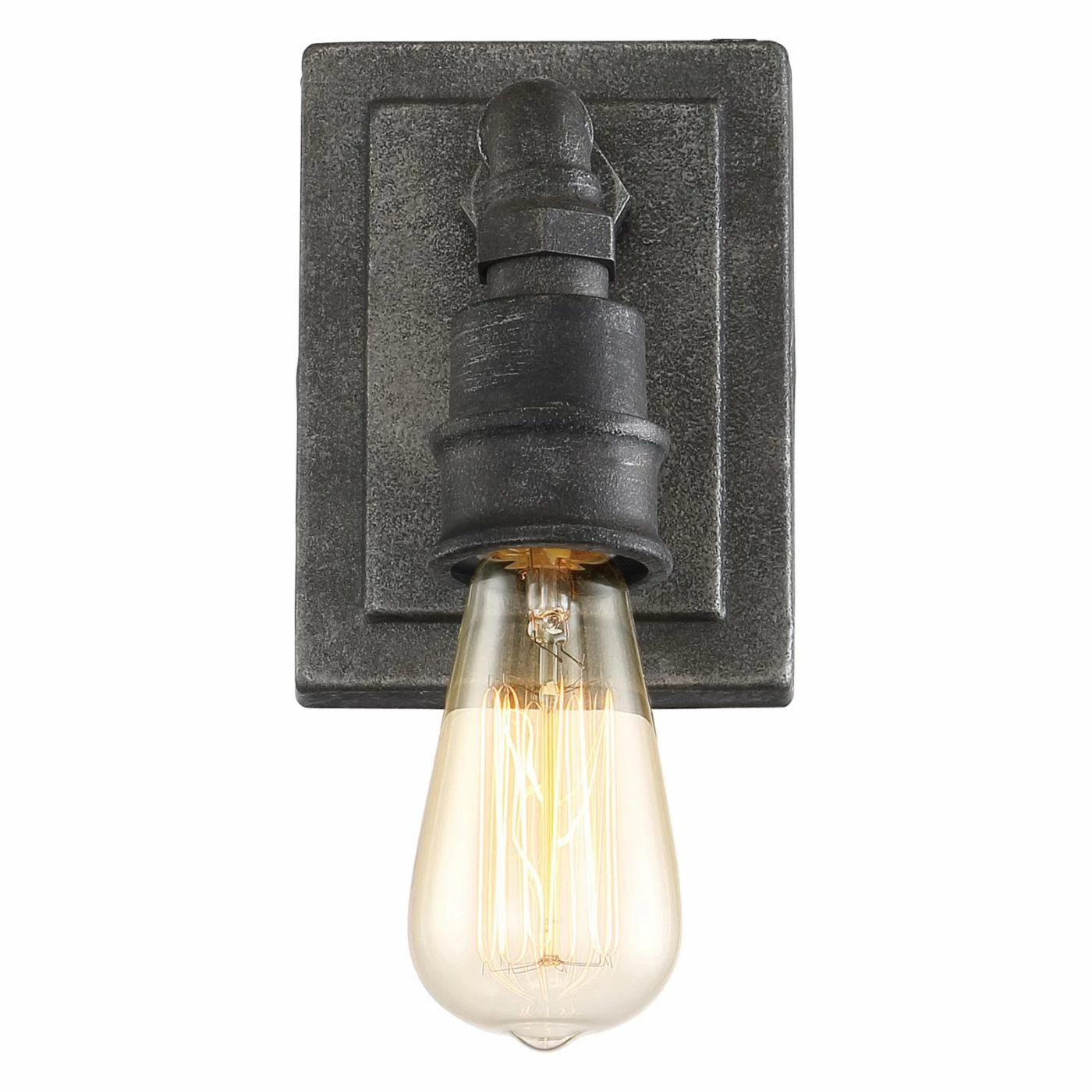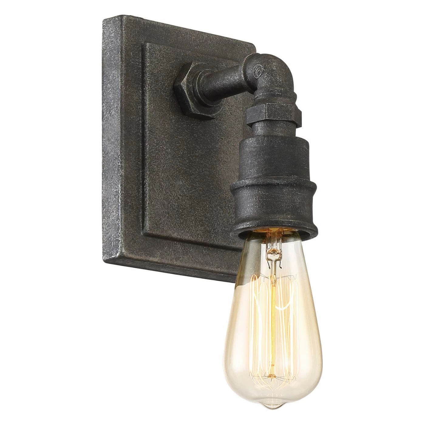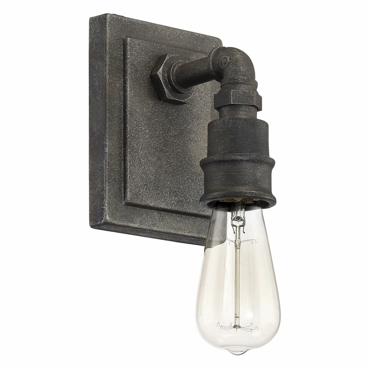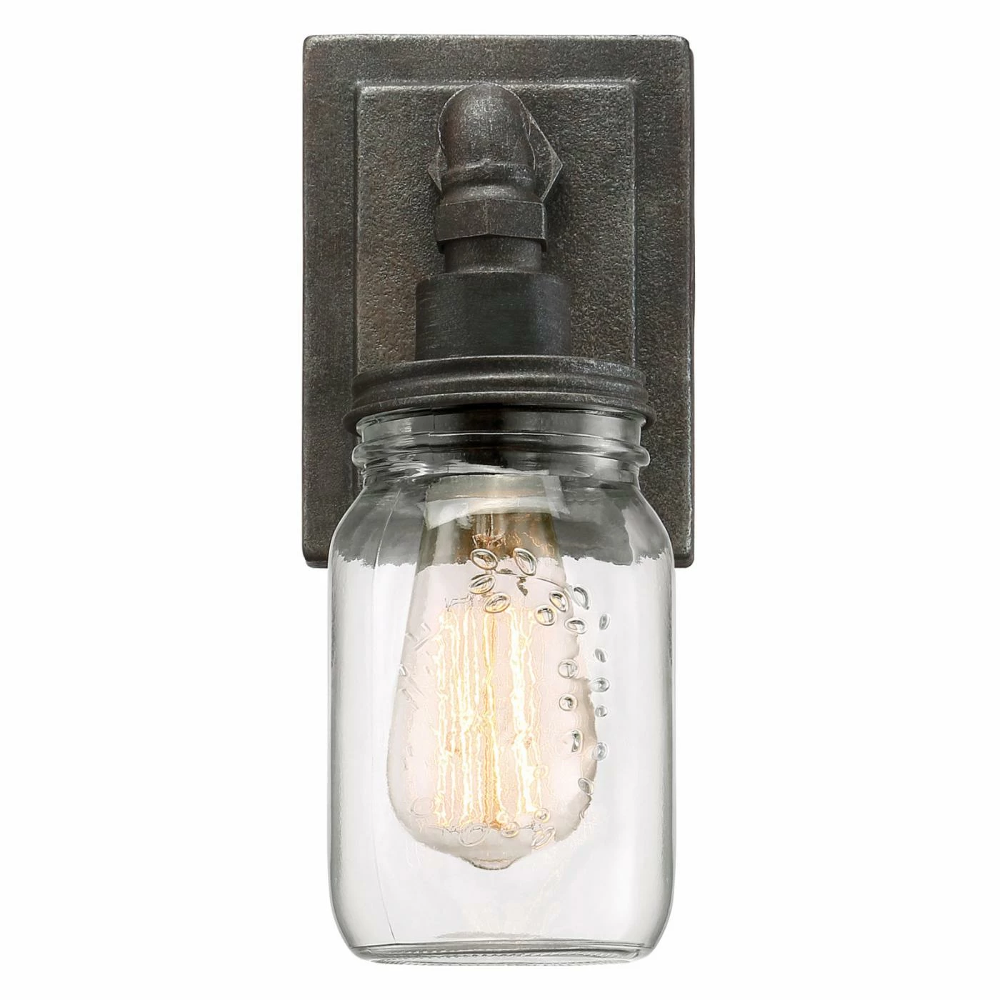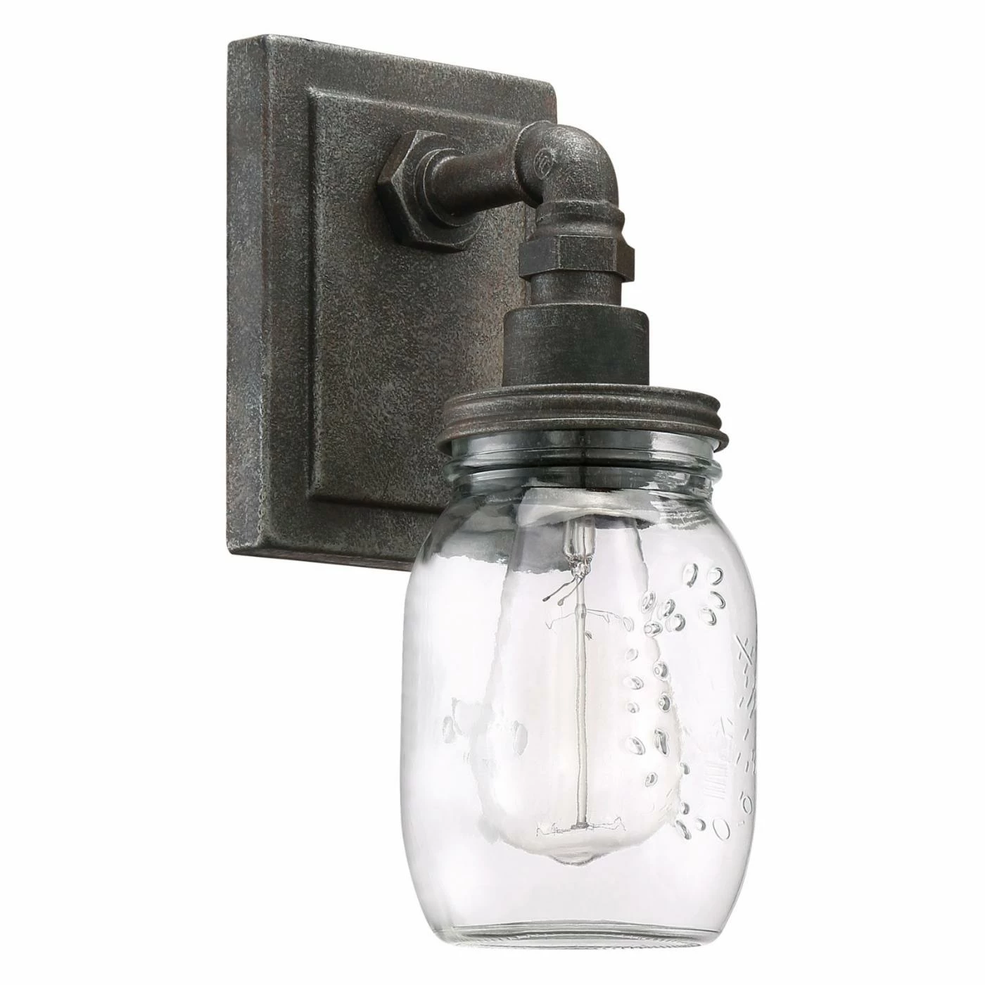 Country chic and industrial elements meet in the design of the Quoizel Squire SQR8701RK 1 Light Bathroom Vanity Light. Intended to hold one vintage-style bulb, this wall-mount down light has a mason jar-shaped, clear glass shade embellished with a fruit motif. Its down-turned, rustic black-finished metal arm resembles plumbing pipework and is mounted to a rugged, stepped backplate.