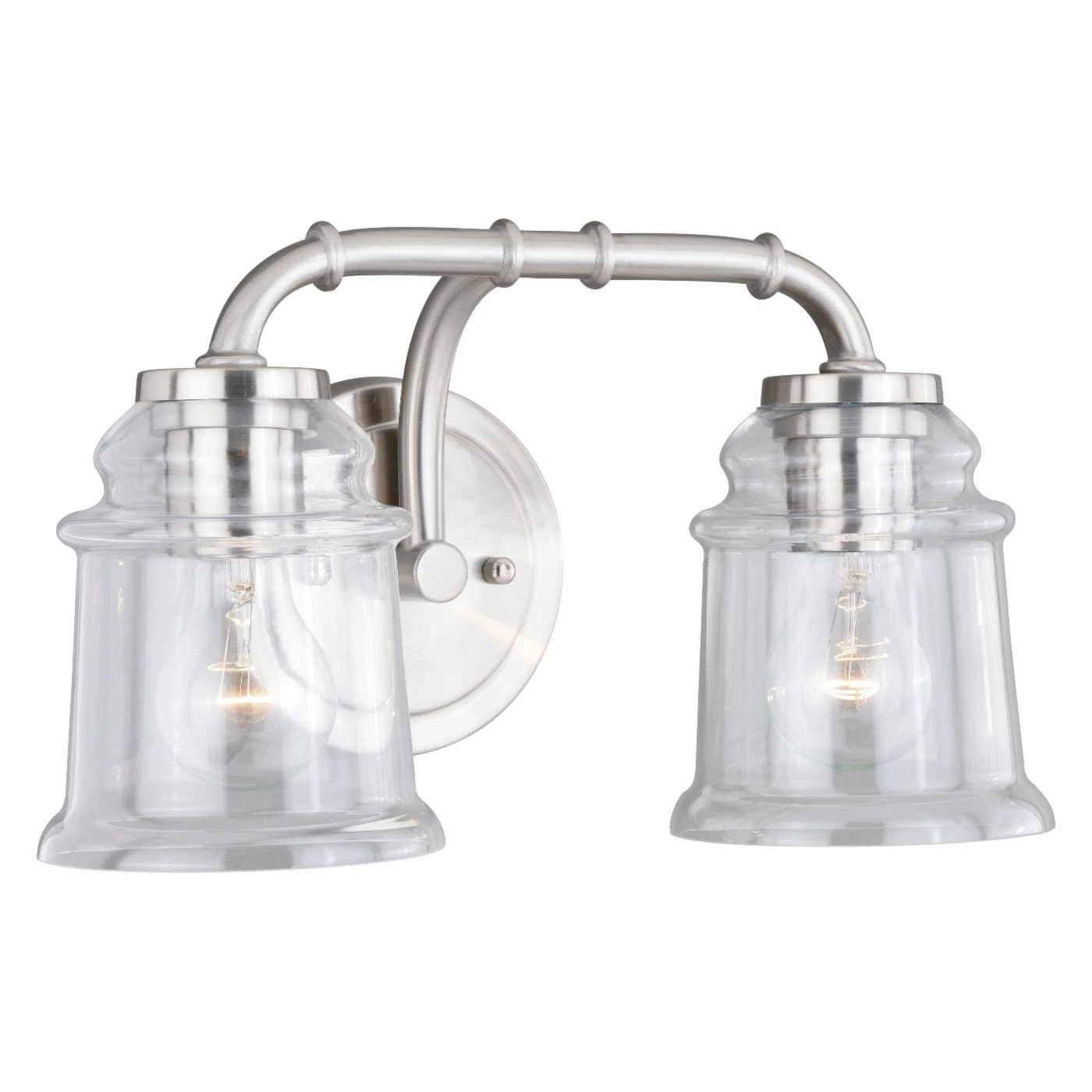 The Vaxcel Toledo W0240 Bathroom Vanity Light helps you update the look of your bathroom in modern style. This vanity light boasts a unique pipe-like fixture finished in sleek satin nickel. This double vanity light includes clear blown glass shades to help it emit a bright light for primping and brushing your teeth.