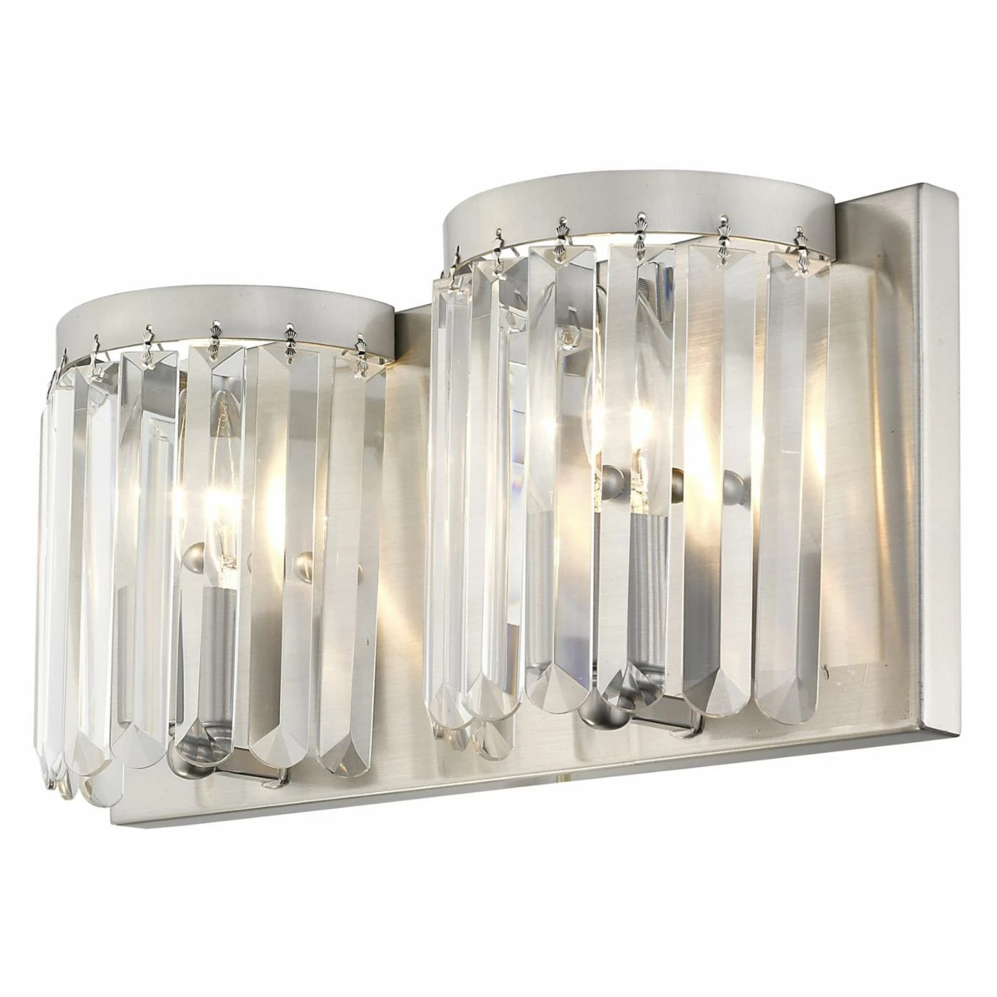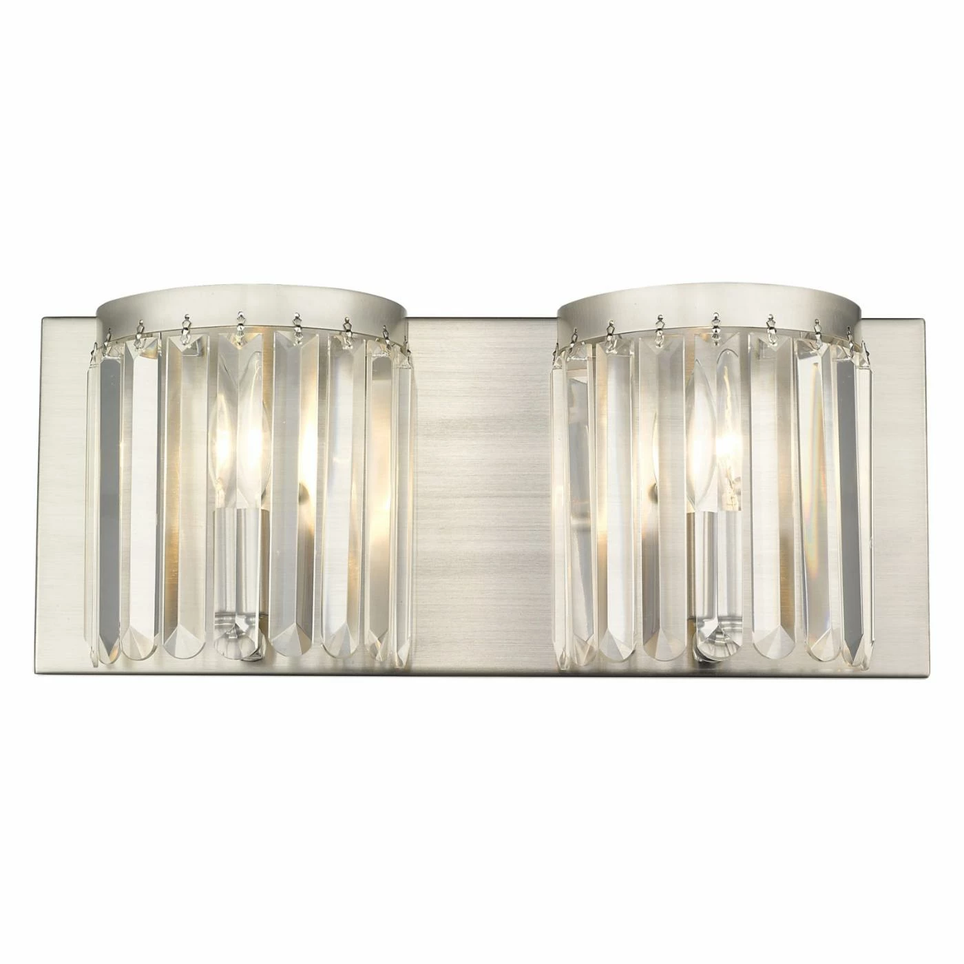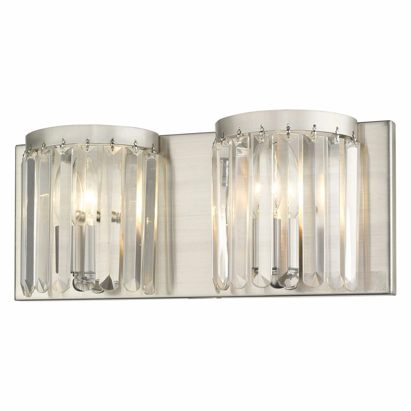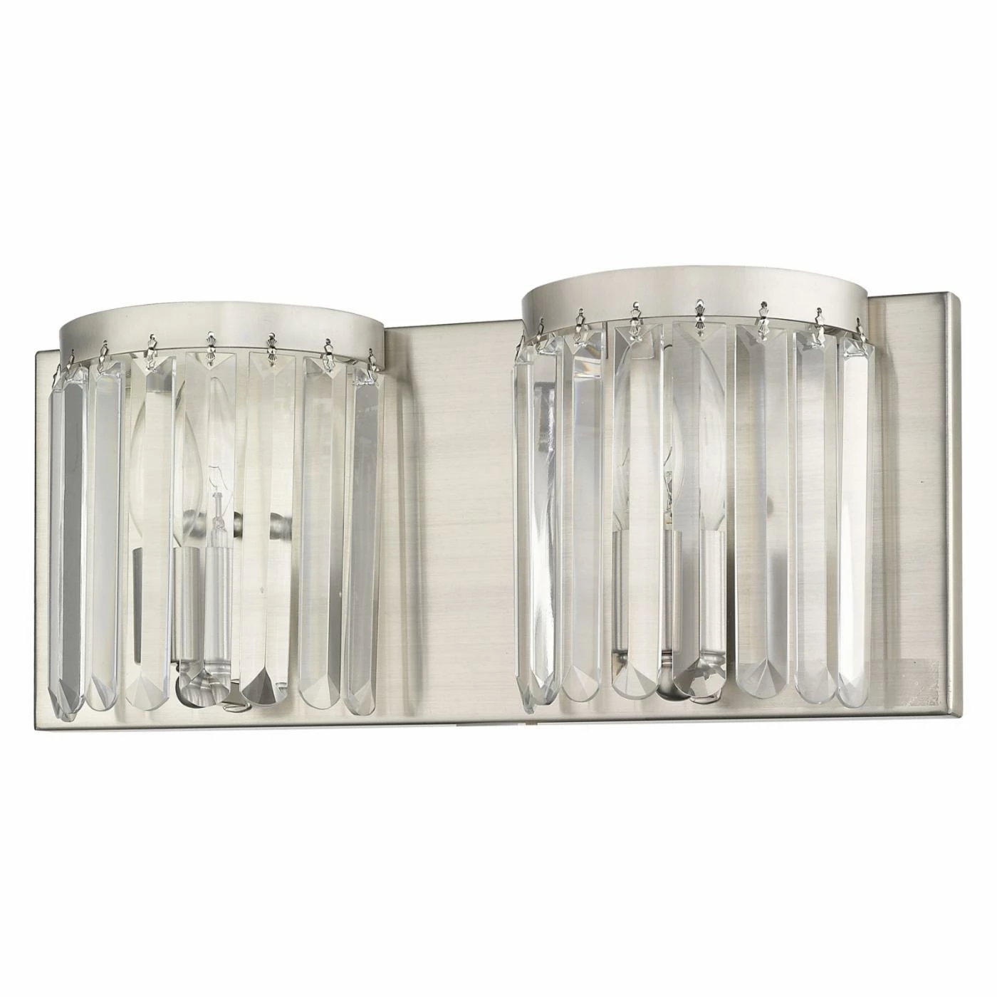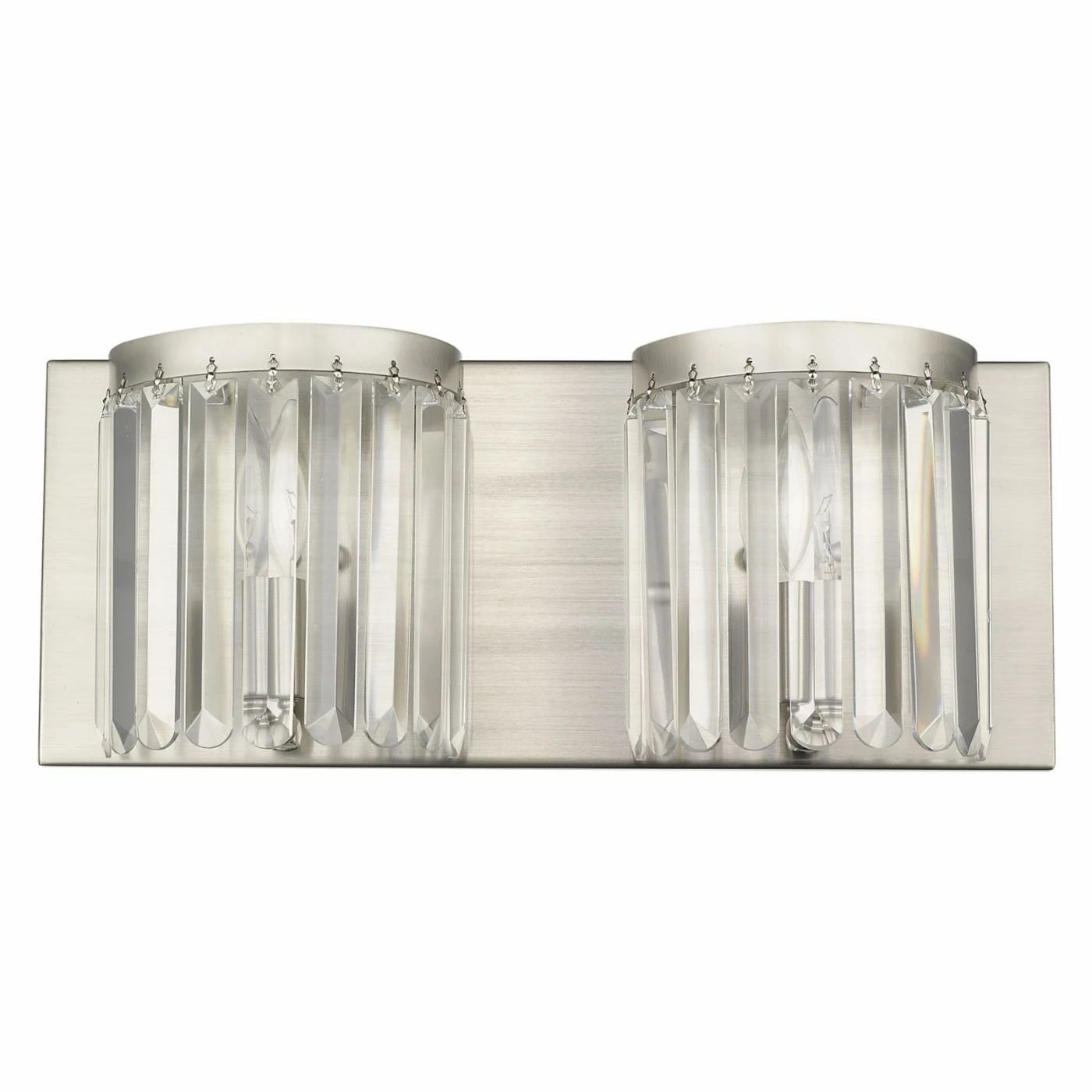 The Livex Lighting Ashton 50532 2 Light Bathroom Vanity Light features a brushed nickel back plate with sparkling crystal shades. Requires two 60-watt candelabra base bulbs (not included).