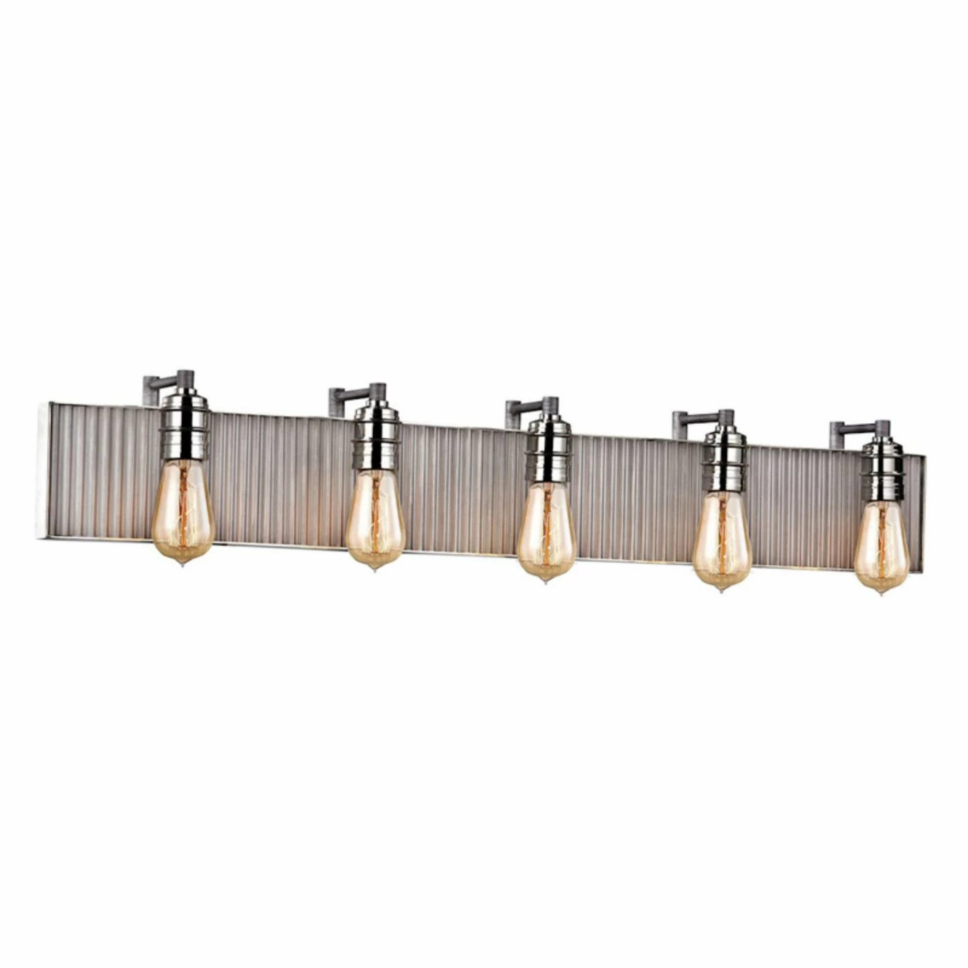 Offering stunning illumination, this Elk Lighting Corrugated Steel 15924/5 5 Light Bathroom Vanity Light is finished in a bright polished nickel and is supported by a metal backplate. This vanity light requires five 60-watt incandescent medium base bulbs (not included).