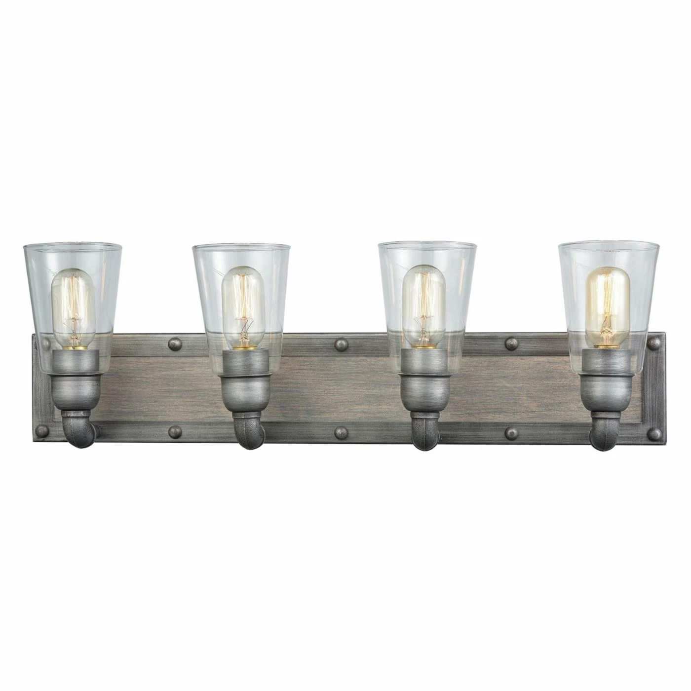 Give your dΓ©cor a bold, industrial look with the ELK Lighting Platform 14473/4 Bathroom Vanity Light. Elongated glass shades sit on piped arms, enhancing the elemental style of this vanity light with a weathered zinc finish. The backplate is crafted of sturdy metal and features a framed accent with peg detailing.