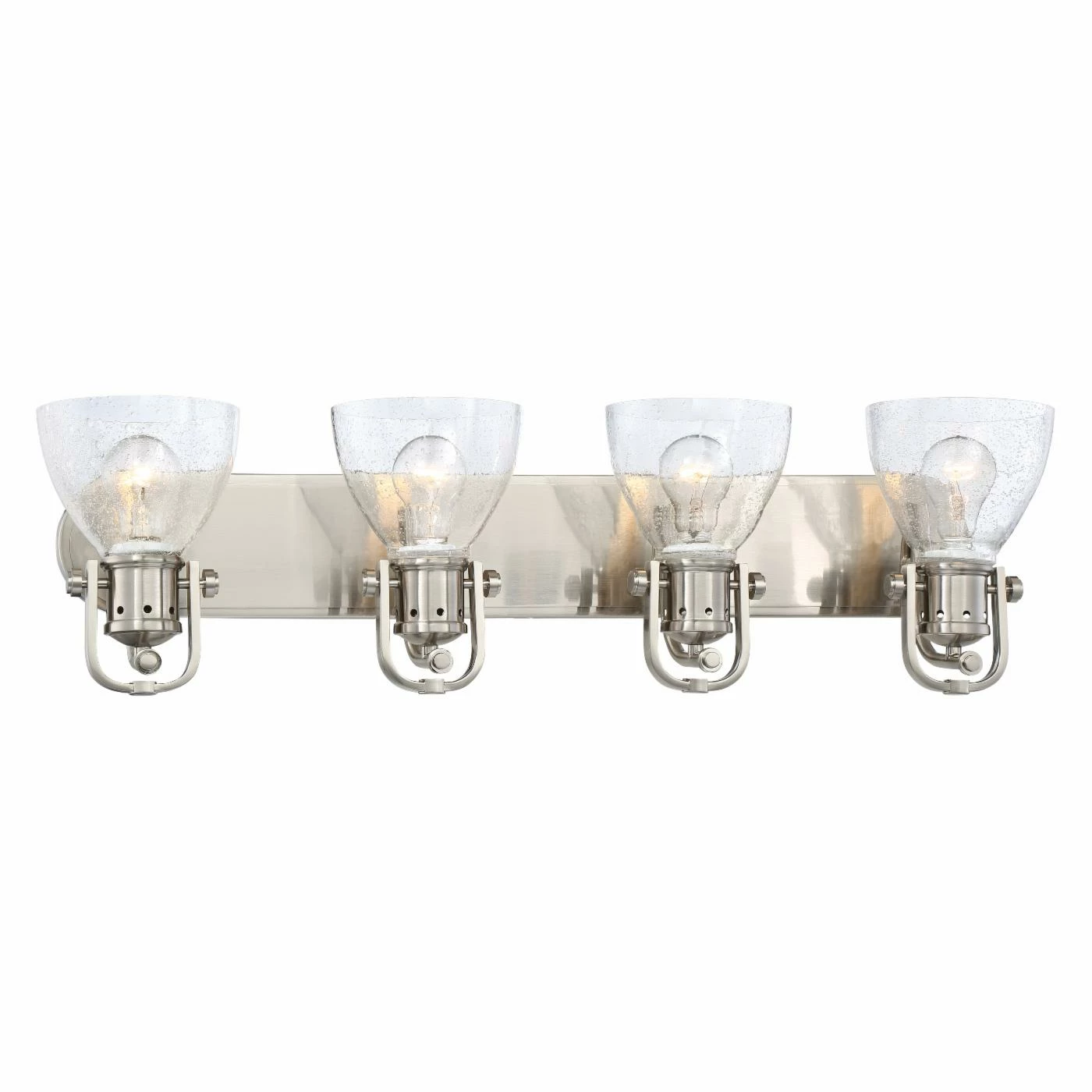 Go retro chic in your master bathroom or guest bath with the Minka Lavery 3414-84 Bathroom Vanity Light. Clear seeded glass shades keep the four lamps exposed but still diffuse their glow to reduce glare. Industrial-style, brushed nickel-steel housings and a rectangular backplate finish the design.