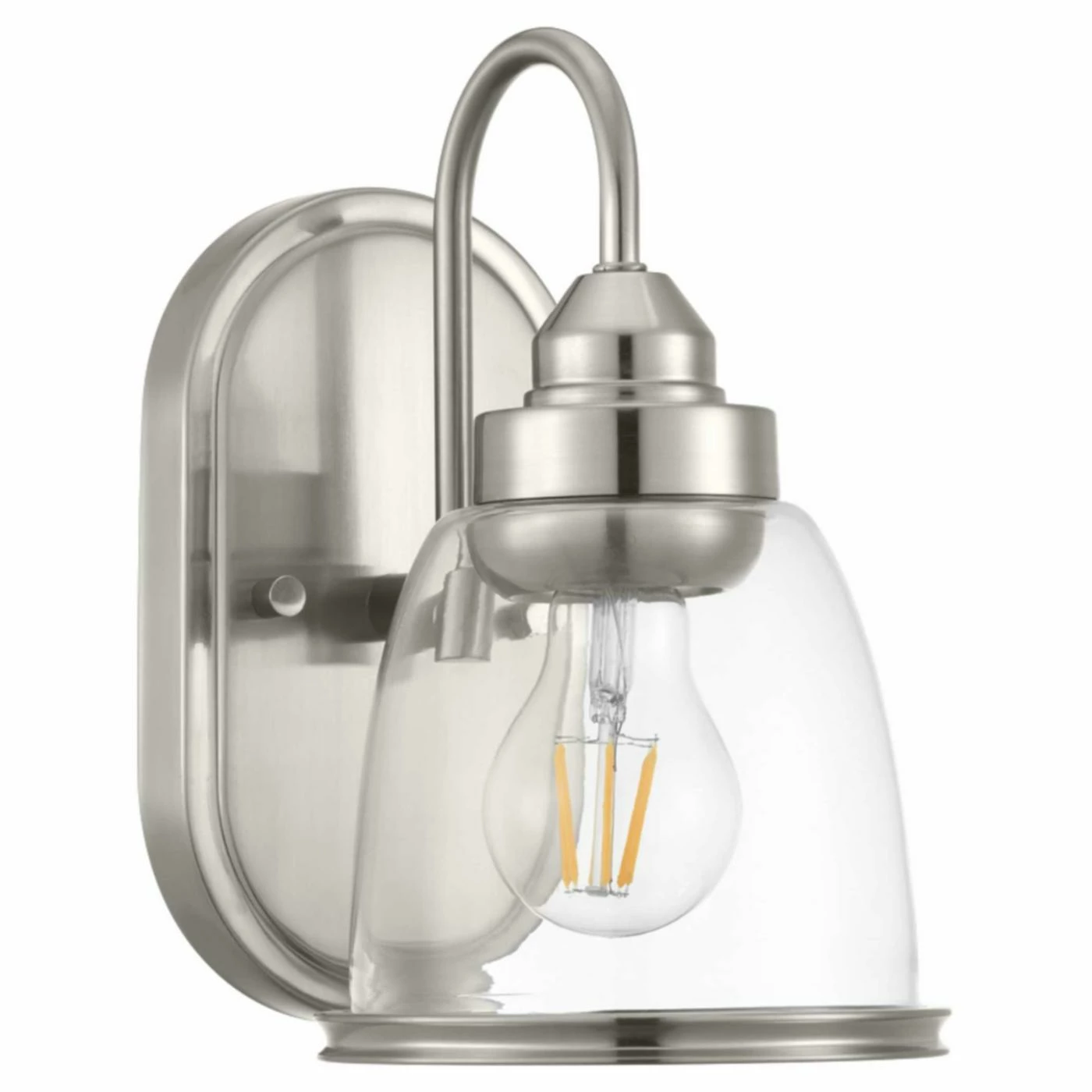 Your bathroom is an important, often forgot about, space in your home, give it some love with the Progress Lighting Saluda Bathroom Wall Sconce. This contemporary bathroom vanity light has a long bar with a single curved arm holding up a dome shade. The shade is constructed from clear glass to show off the bulb inside. This bathroom sconce comes in your choice of available finish option, so you may customize it to your style. This light fixture requires one 60-watt incandescent bulb that is not included.
