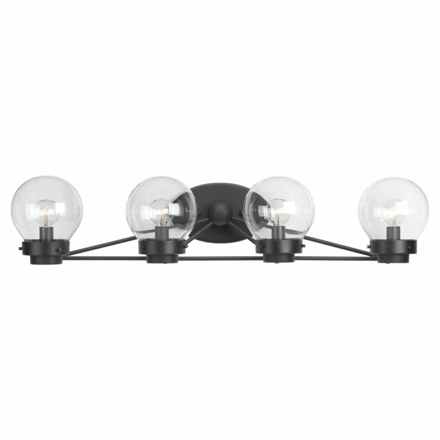 Your futuristic style will shine brightly in your bathroom with the Progress Lighting Spatial 4 Light Bathroom Vanity Light. The steel frame has a unique triangular design that holds up the four globe shades. The frame of this bathroom vanity light comes in a matte black finish and the shades are clear glass. This light fixture requires four 60-watt incandescent bulbs that is not included.