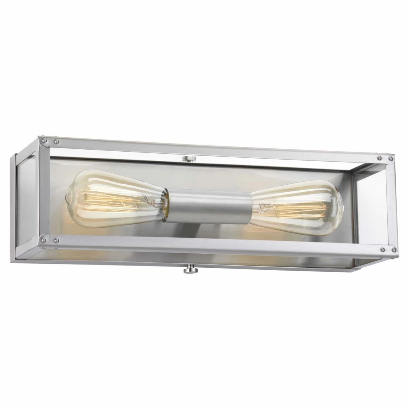 Provide your bathroom with a futuristic style element from the Progress Lighting Union Square 2 Light Bathroom Vanity Light. The clear glass box, framed with stainless steel, surrounds two lightbulbs. This light fixture requires two 100-watt incandescent bulbs that are not included.