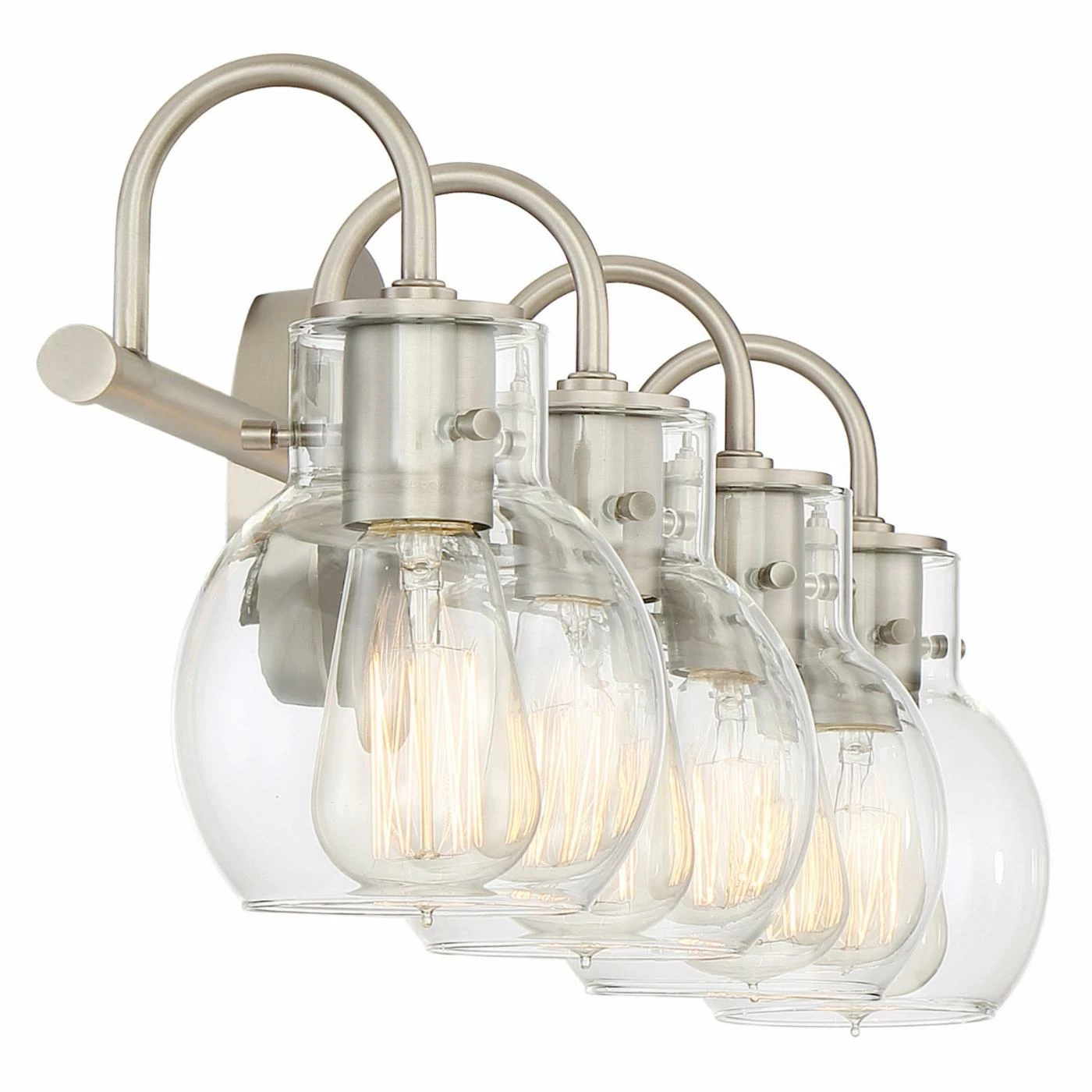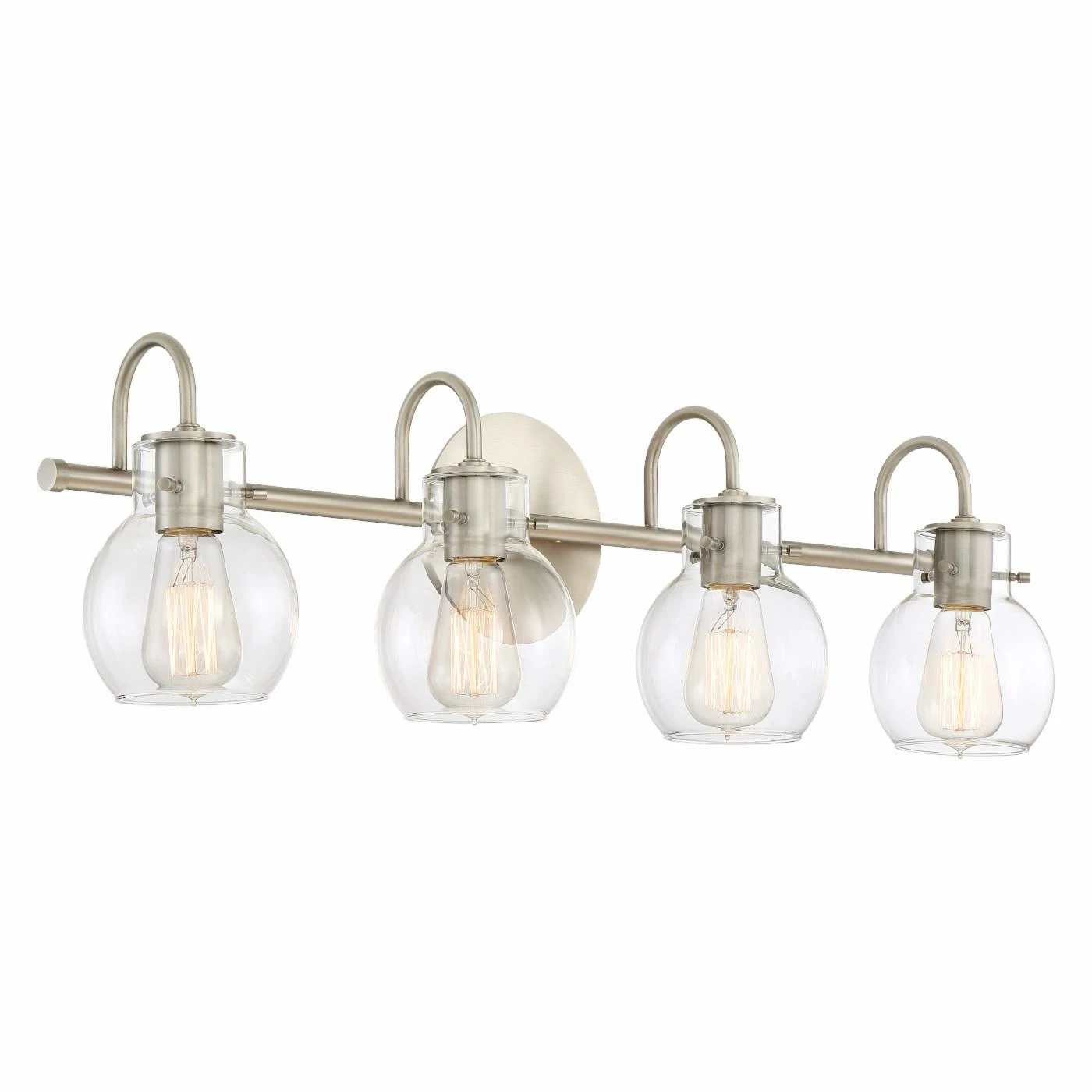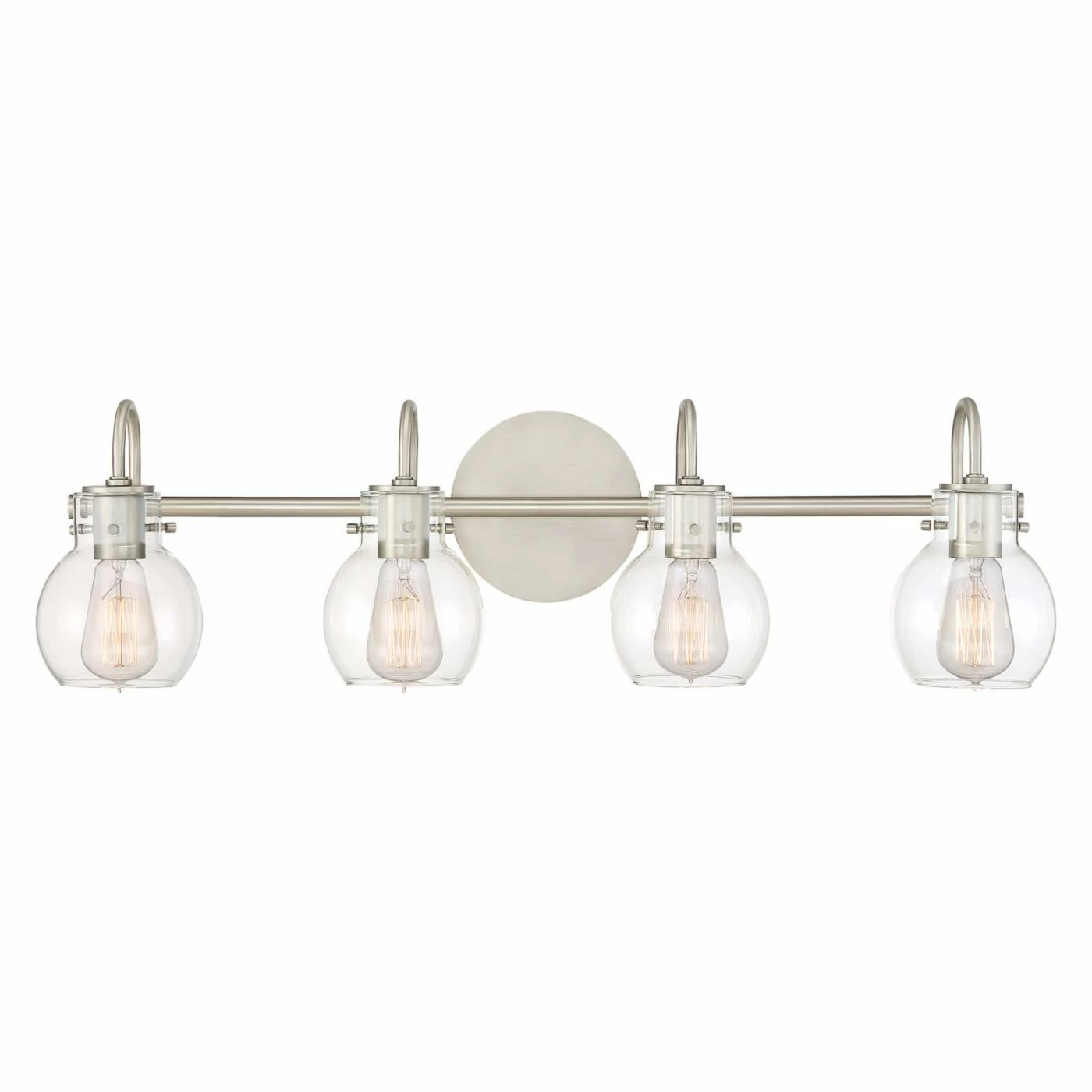 The Quoizel Andrews ANW8604AN Vanity Light emboldens your bathroom with its modern, contemporary design. Four large glass globes are held by a beautiful antique nickel finished mount, and they look elegant when you install a vintage or Edison-style bulb. This lovely light brings brightness and beauty to your bathroom for a unique source of light that stands the test of time.
