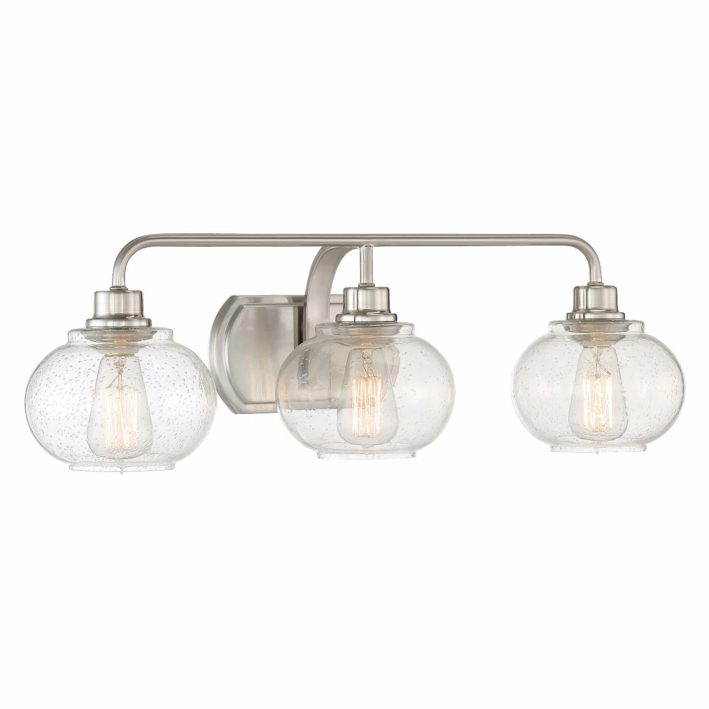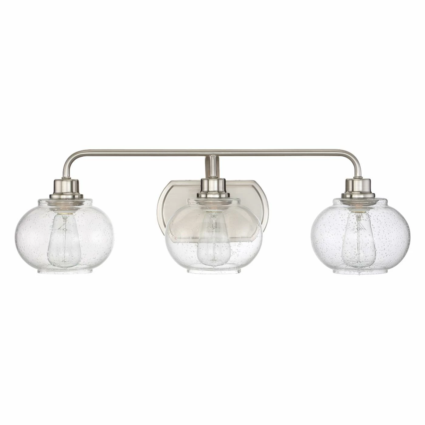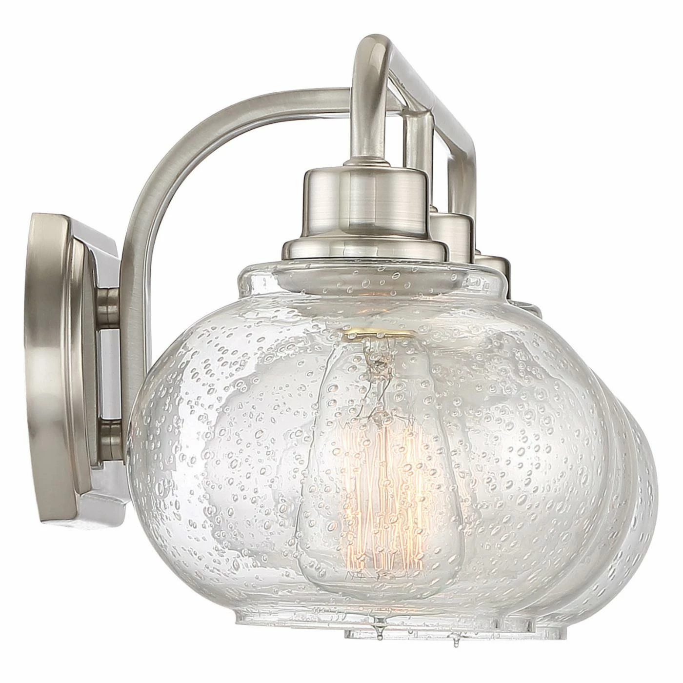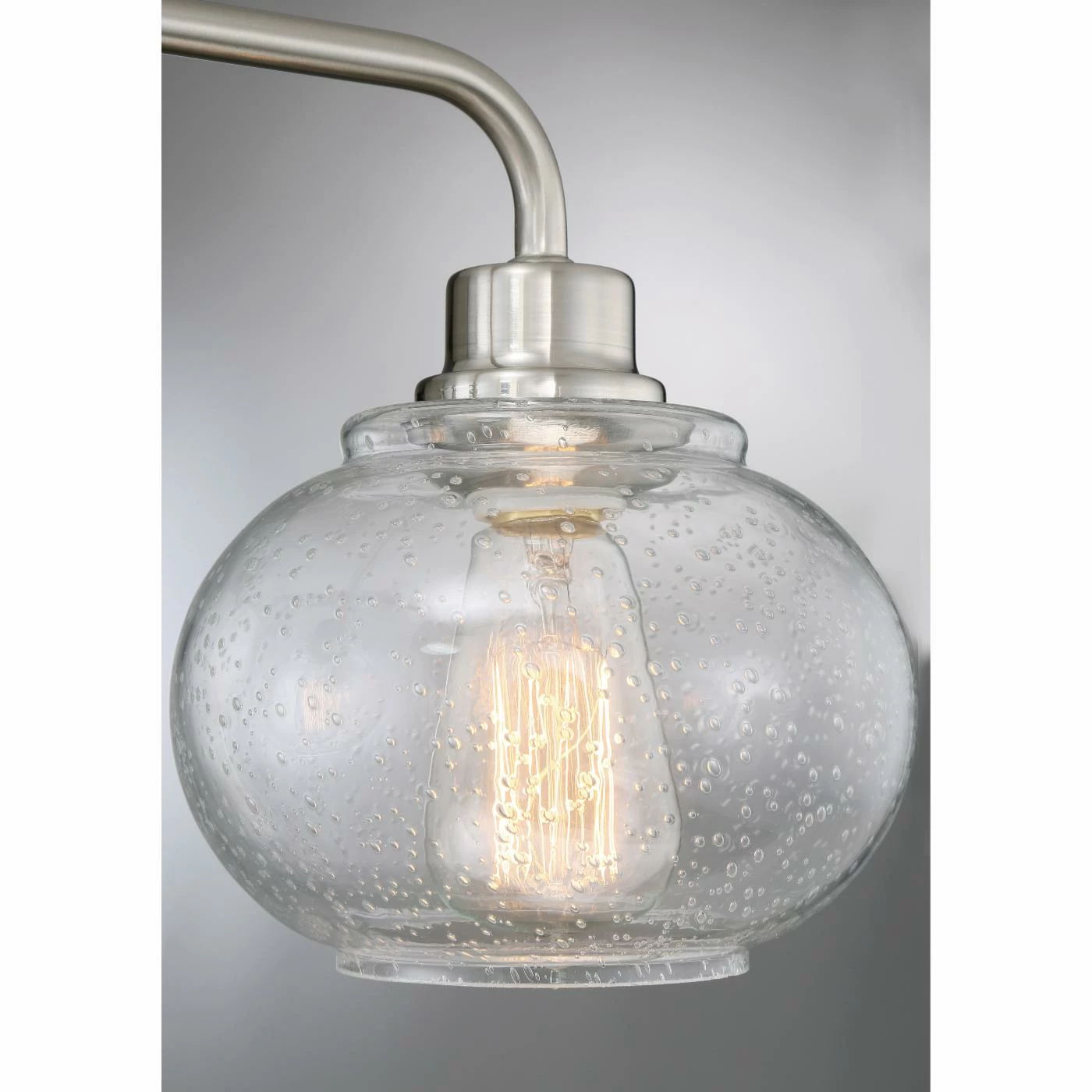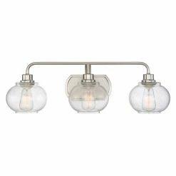 The Quoizel Trilogy TRG8603BN Vanity Light gives your bathroom a contemporary update with large rounded clear bubble glass shades. The shades help to highlight the vintage bulb inside, while the modern brushed nickel finished frame brings it a modern, chic touch.