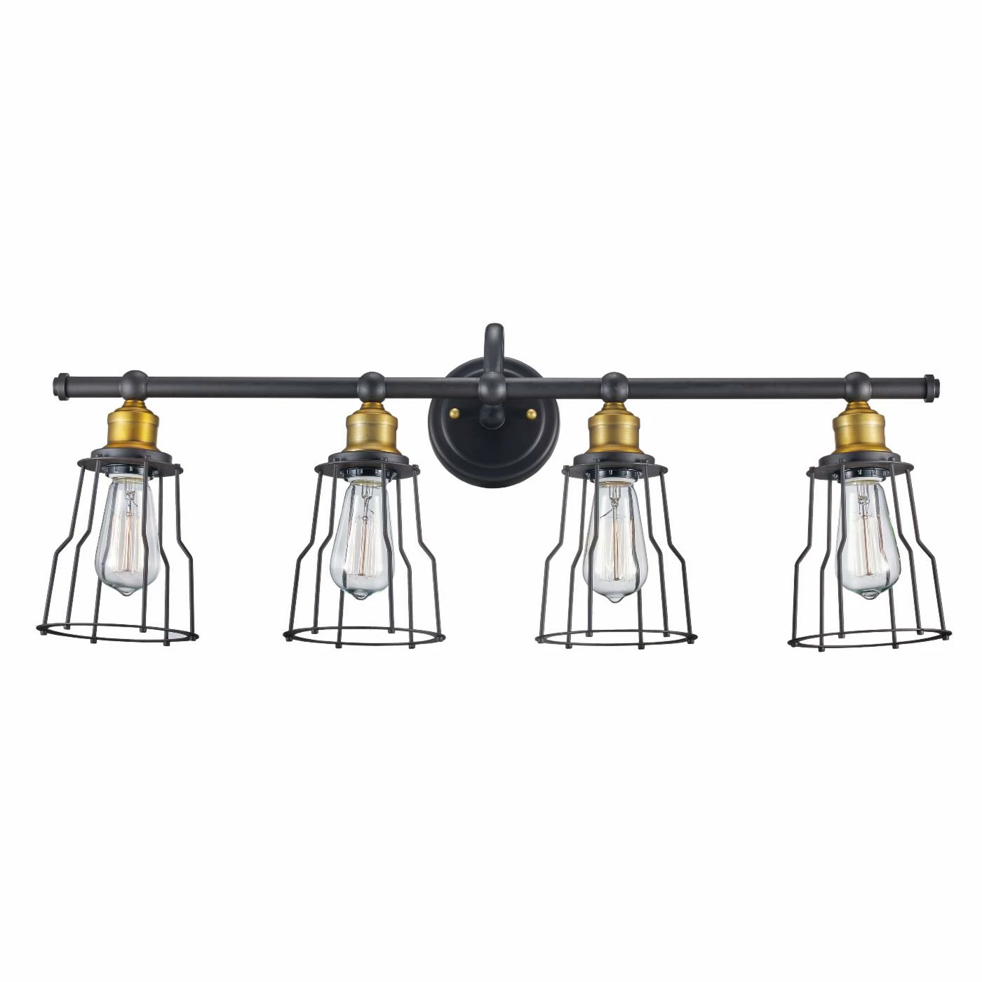 Edgy metal cage shades show off the Trans Globe Lighting Constitution 70814 ROB Bathroom Vanity Light‘s four bare 60-watt bulbs. The rich oil rubbed bronze finish of the simple metal framework gives this light rustic-chic allure.