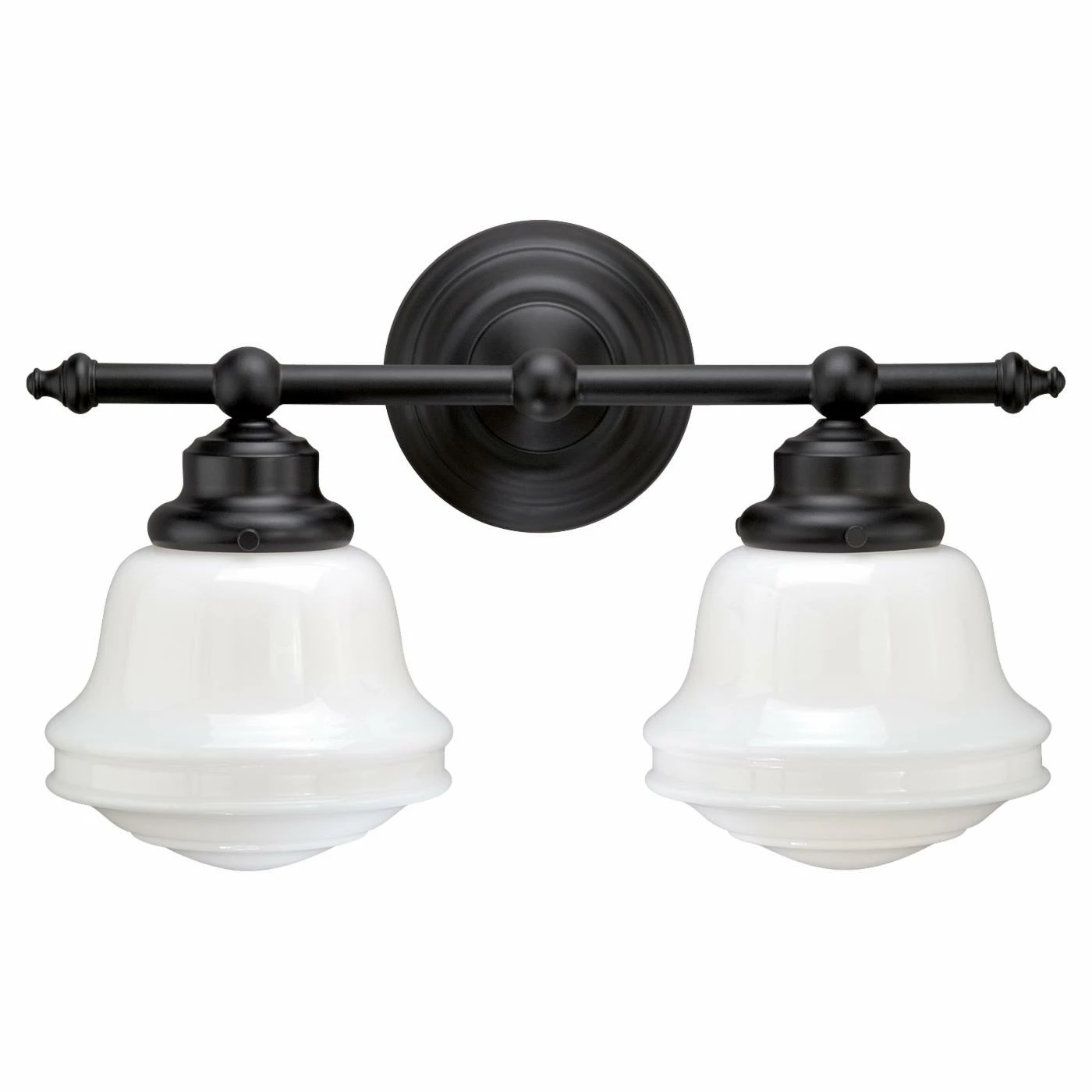 The classic Vaxcel Huntley W016 2 Light Bathroom Vanity Light features an industrial chic bar frame that comes in bold finish options. Two shapely, fully enclosed milk glass shades diffuse light and create a welcoming glow. Mount this bathroom vanity light as an uplight or downlight. It requires two 60-watt bulbs, not included.