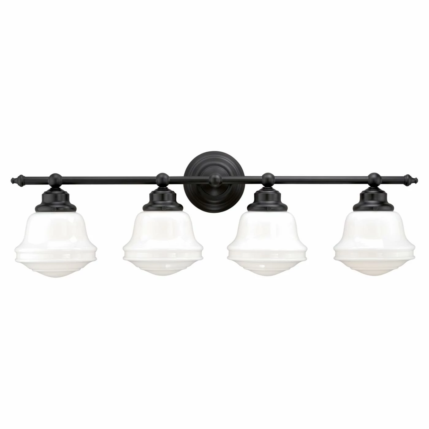 The Vaxcel Huntley W017 4 Light Bathroom Vanity Light boasts an industrial chic bar frame in handsome finish options and a collection of four shapely, fully enclosed milk glass shades. Mount this versatile bathroom vanity light as an uplight or downlight. It requires four 60-watt bulbs, not included.