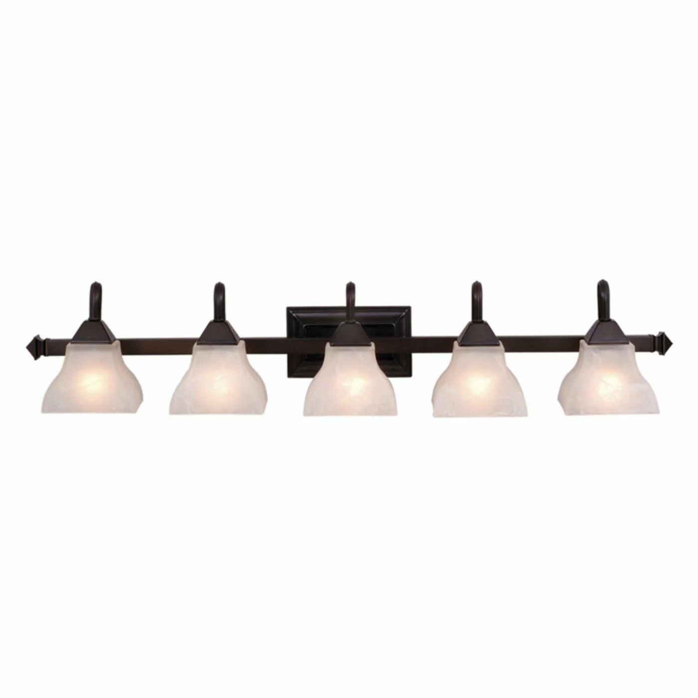 Introduce bold transitional style and illuminate beautifully with the Vaxcel Lighting Cardiff VL26305OBB 5 Light Bathroom Vanity Light. This distinctive bathroom vanity light has a handsome bar fixture in oil burnished bronze finish and sports four square alabaster glass shades. Mount it as an uplight or downlight. This vanity light requires five 100-watt bulbs, not included.