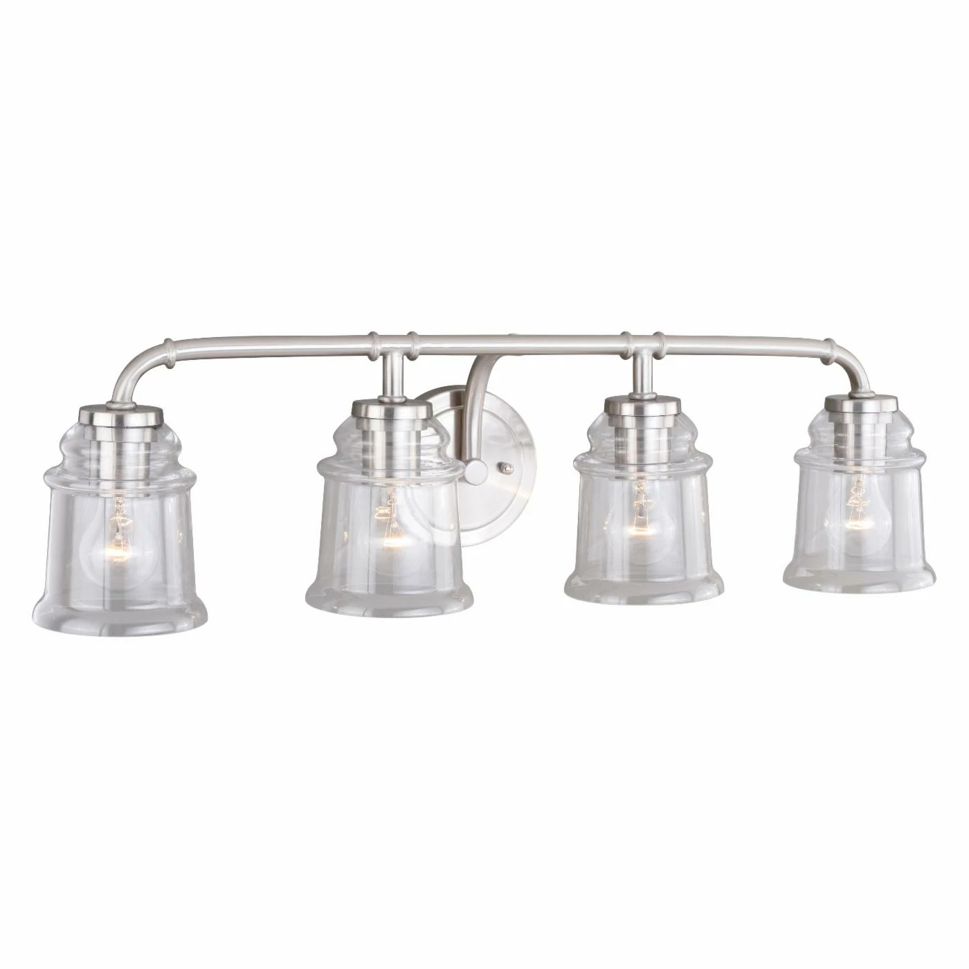 Elevate the look of your bathroom with the Vaxcel Toledo W0242 Bathroom Vanity Light, featured in a four-light configuration. This large, sleek vanity light is enriched in a modern brushed nickel finish. Clear blown glass shades give it an airy vibe.