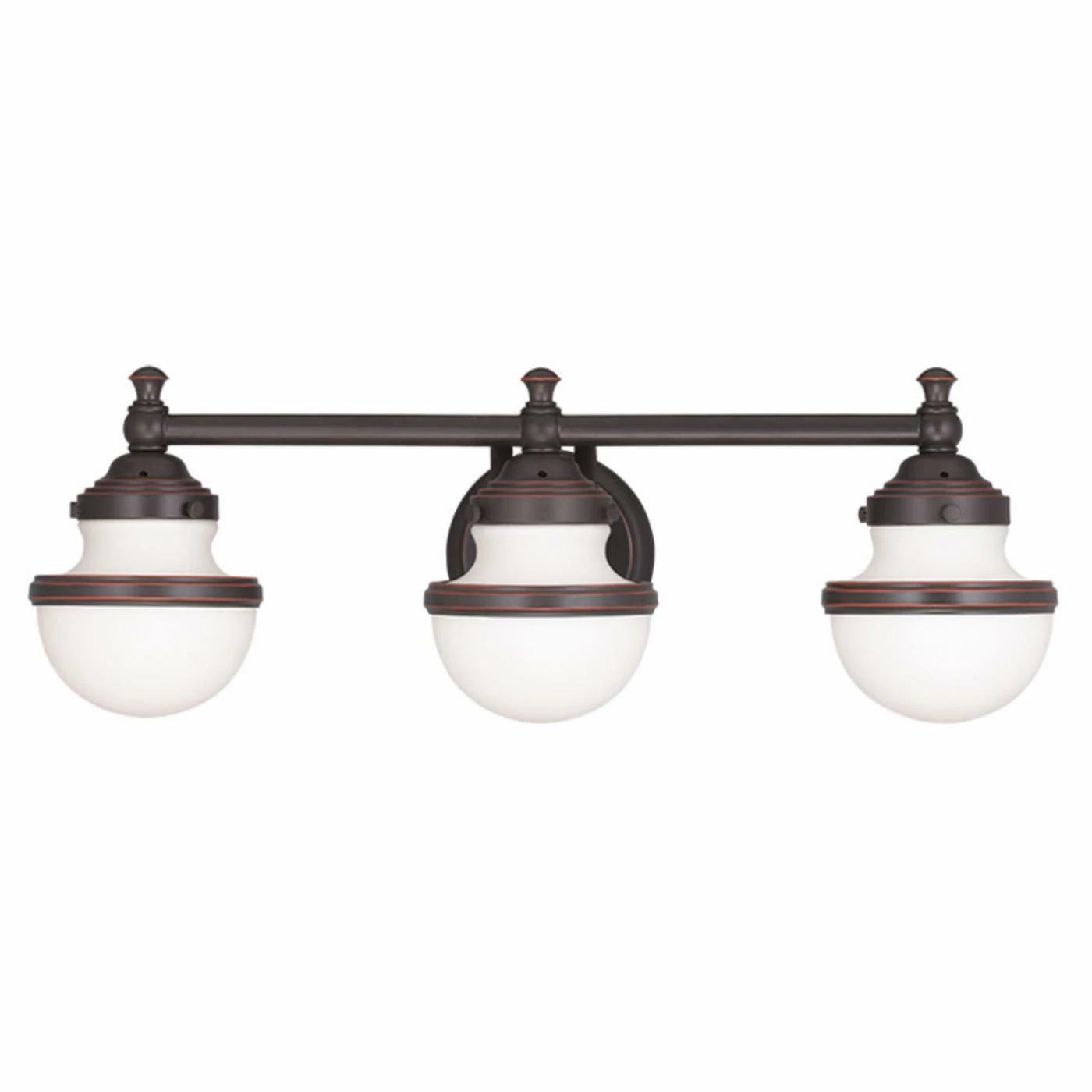 The classic style of the Livex Oldwick 5713 Bathroom Vanity Light is going to add an elegant charm to any space. This damp-rated fixture starts with a metal body that is offered in a full range of finishes to suit any home decor style. Each 100-watt, medium-base bulb is covered by a two-part shade of frosted glass, casting a wide, room’s worth of diffuse light.