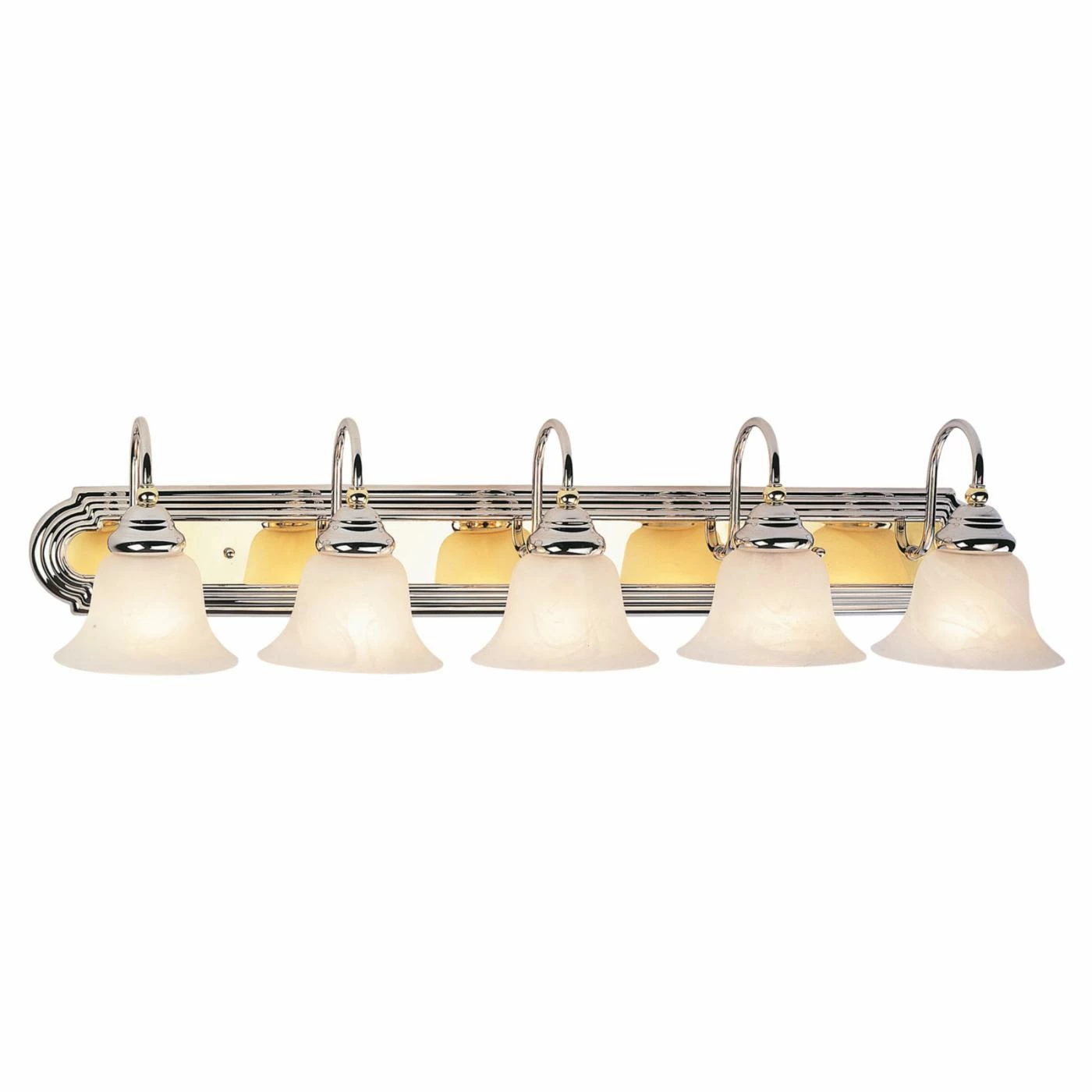 Finding a new fixture may be a risky process, but the Livex Belmont 1005-52 Bathroom Vanity Light keeps the stakes from getting too high. This elegant fixture has a metal body that features a two-tone finish of bright brass and mirrored chrome that creates a contemporary feel with traditional elements. The fixture has five shades of frosted glass, each covering a single 100-watt bulb. This fixture can also be mounted in an upward- or downward-facing position.