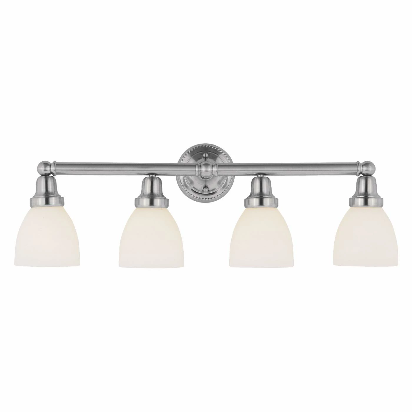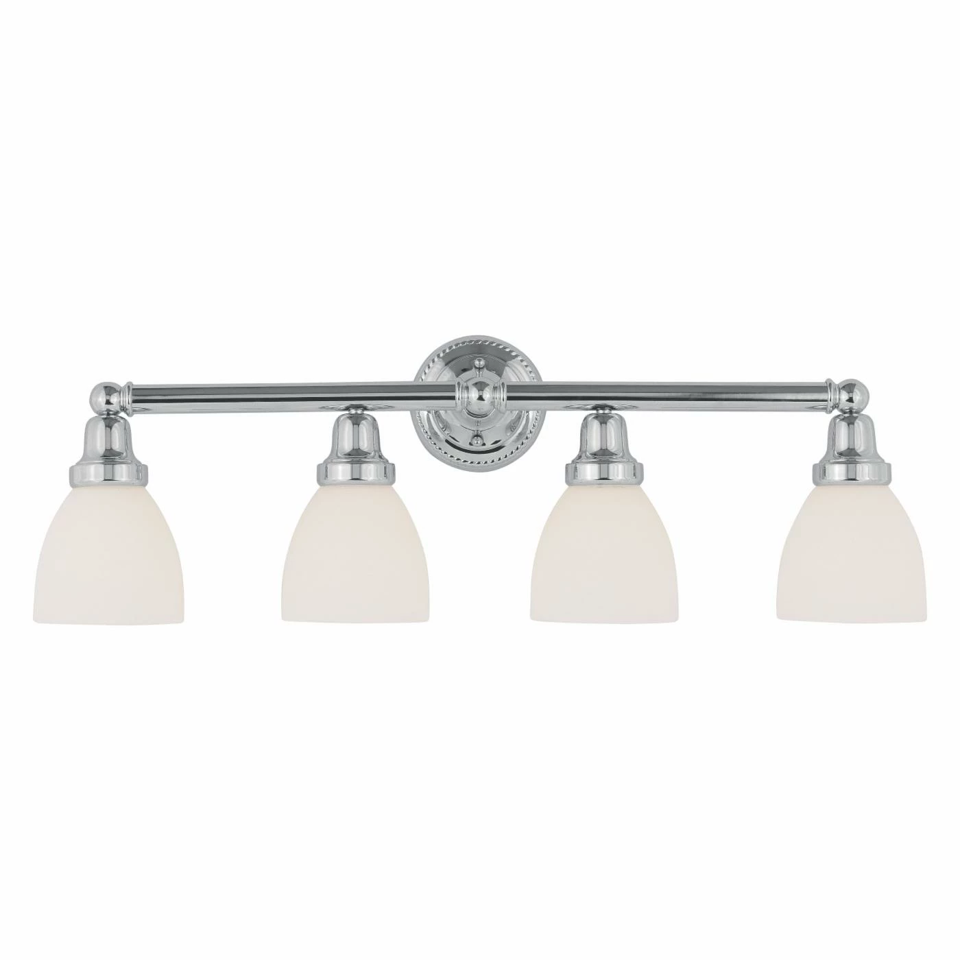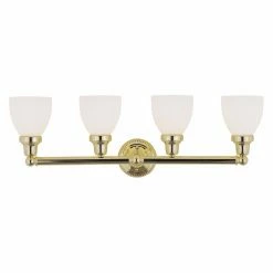 Add lux elegance to your traditional bathroom with the Livex Classic 1024 Bath Vanity – 30W in.. This fixture showcases four lights on a sleek support, each surrounded by a frosted glass shade for soft results.