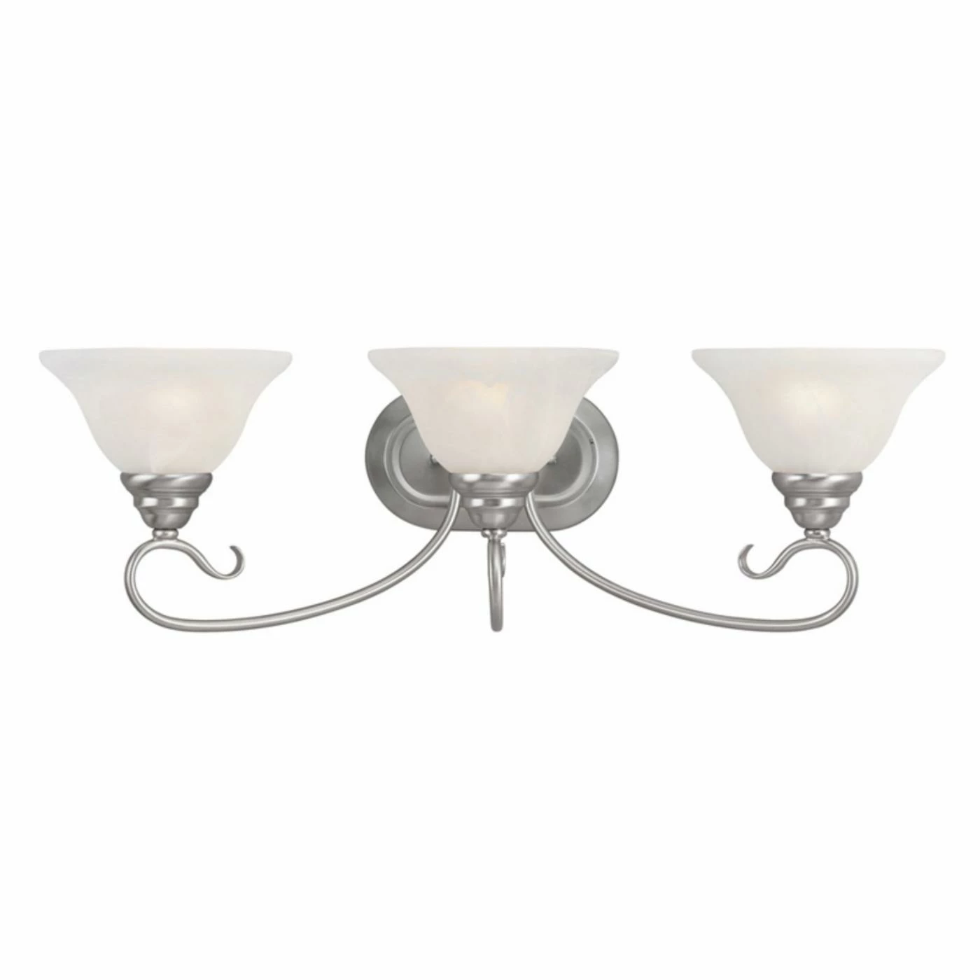 If you want your bath area to make a style statement that’s impossible to ignore, the Livex Coronado 6103-91 Vanity Light – Brushed Nickel – 26.5W in. is the perfect choice for you. The brushed nickel finish highlights the elegance of the white alabaster glass shades, while three 100-watt medium base bulbs (not included) diffuse light into a warm glow that’s functional, yet relaxing. Exuding classic elegance and an updated charm, this 26.5-inch vanity light is UL-listed for damp locations.