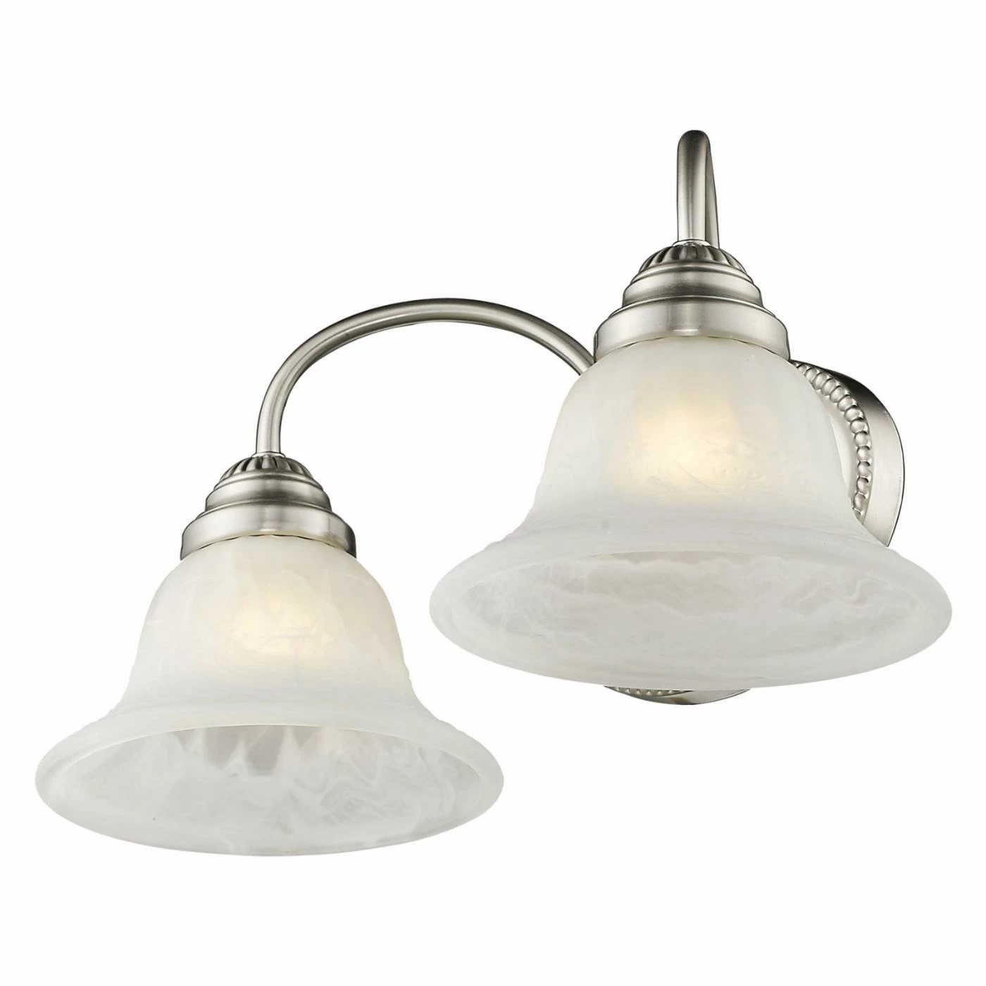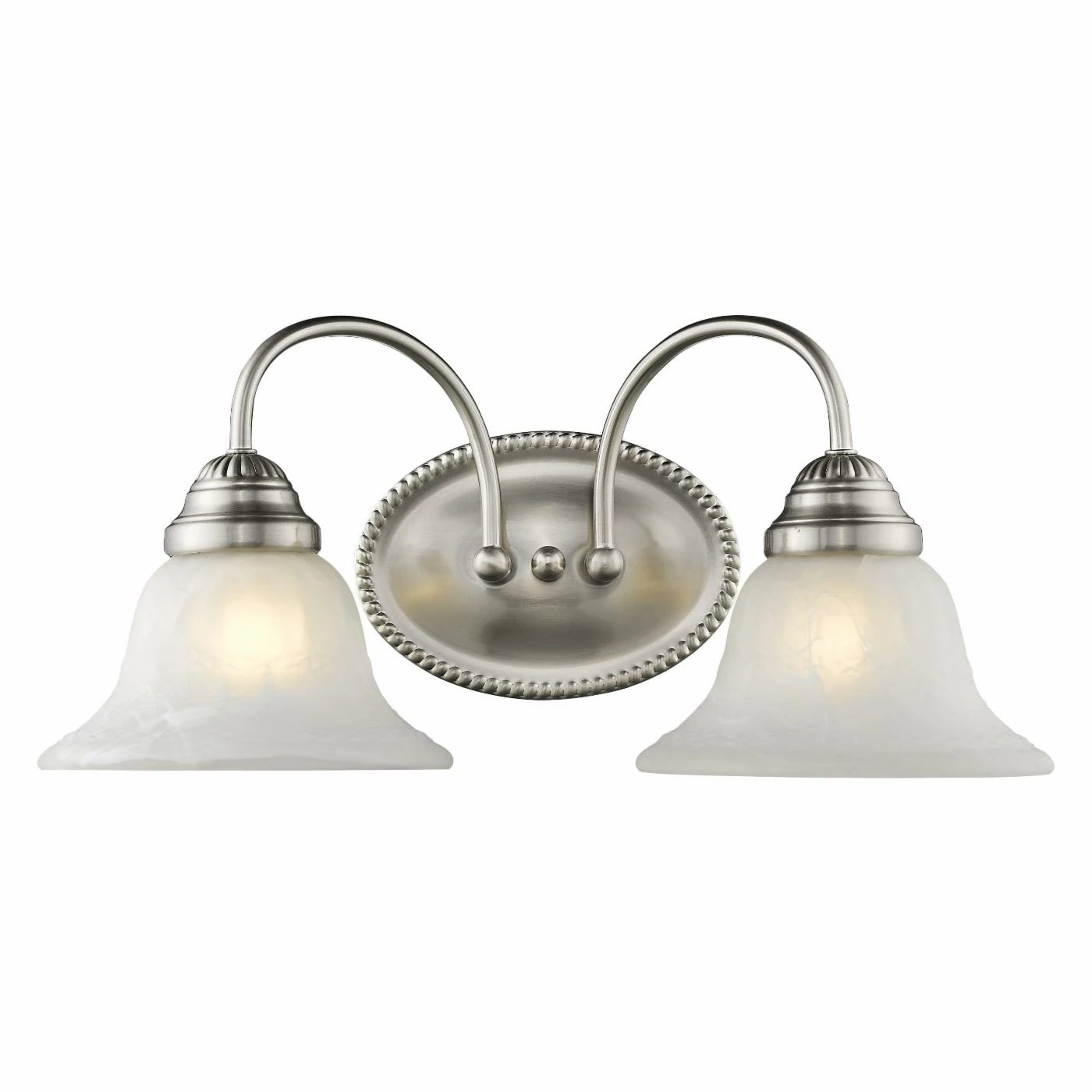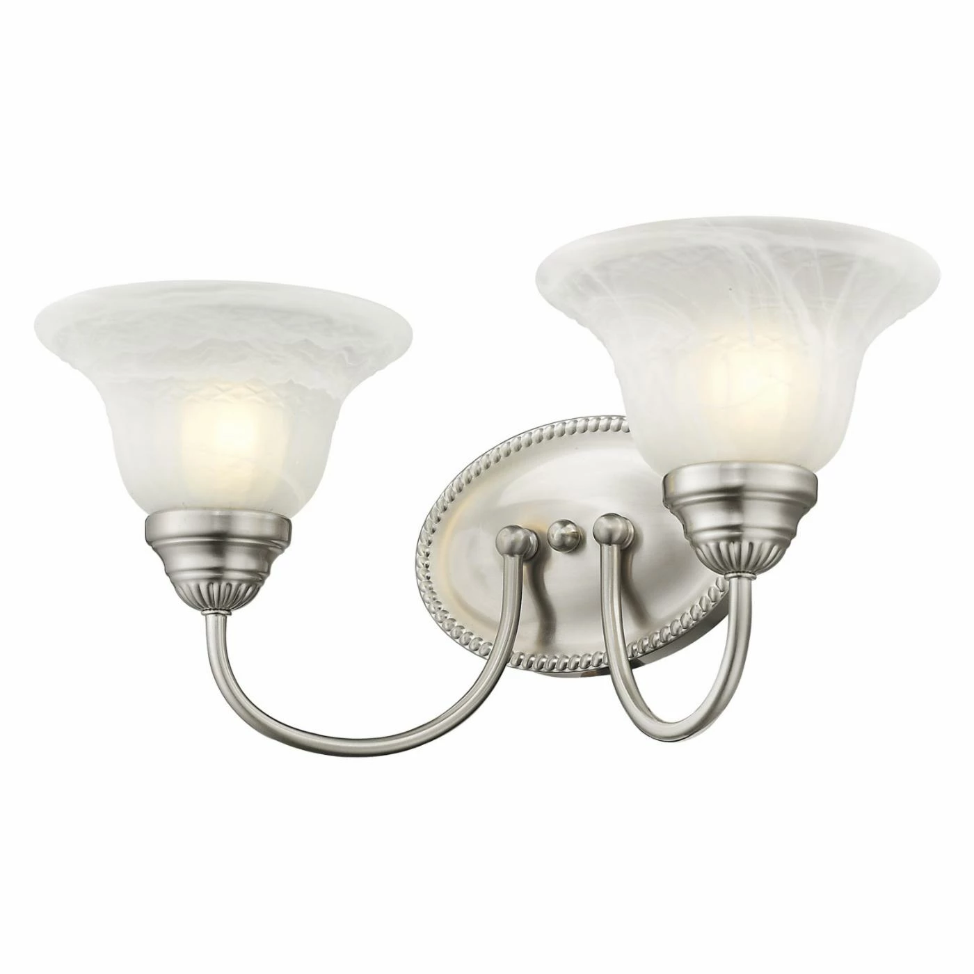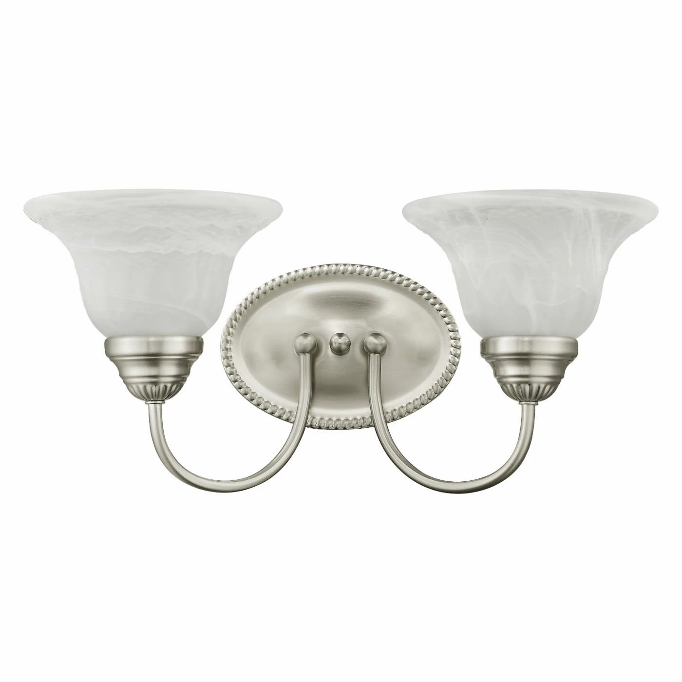 The Livex Edgemont 1532 Vanity Light – 14.25W in. adds a little elegance to your daily routine – even on those bad Monday mornings. Designed to dazzle with a subtle, demure aesthetic, this bathroom light fixture comes in your choice of fashionable finishes. An oval backplate, dainty detailing, and white alabaster glass shades with a beautiful bell shape all combine to create a splendid look for your space. The fixture requires two 100-watt medium base bulbs (not included).