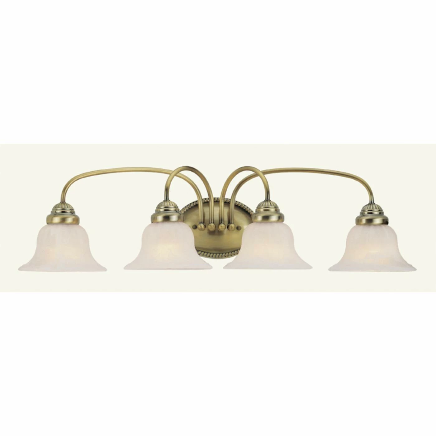 The Livex Edgemont 1534 Vanity Light – 30.5W in. has a sweet style thatβs both elegant and easygoing. Ready to shine in whichever finish you choose, this bathroom light fixture features an oval backplate, dainty details, and slender overhanging arms to create a look thatβs light, bright, and fashionable in any bath. Plus, the bell-shaped shades are made of white alabaster glass, which is sure to garner a few admiring gazes. Youβll need to add four 100-watt medium base bulbs (not included).