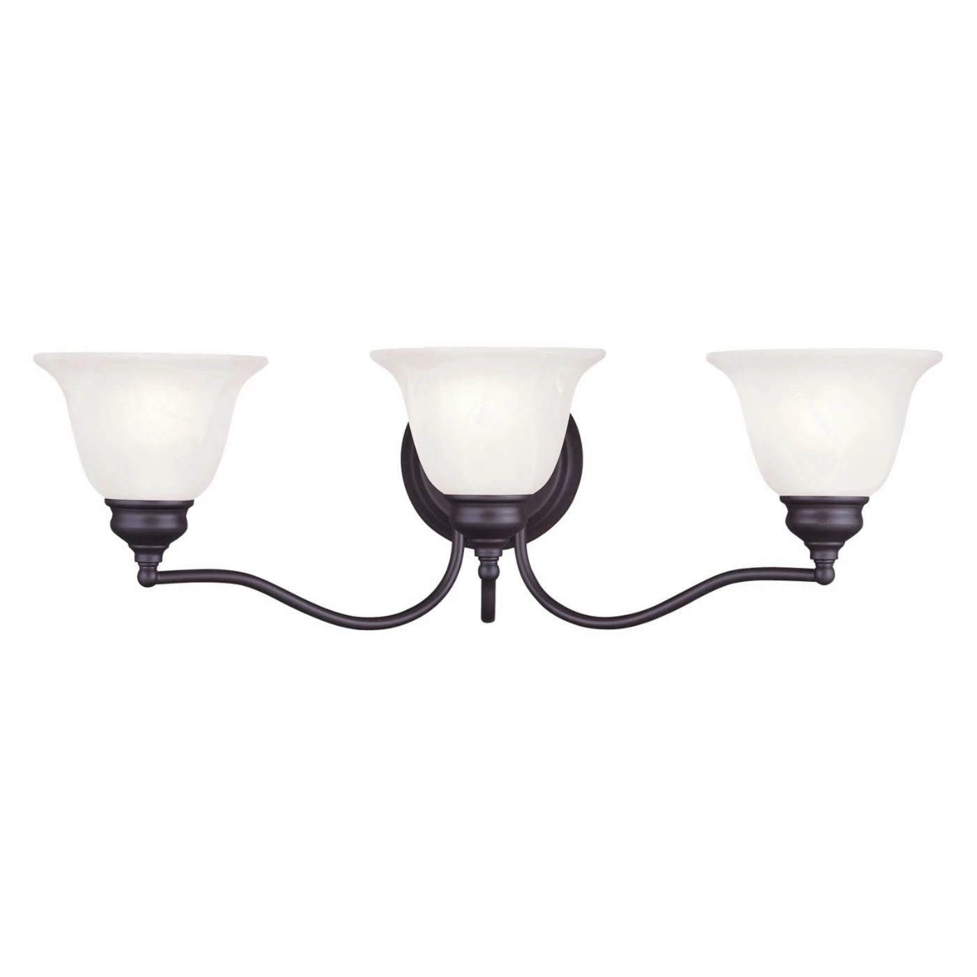 A stylish bath starts with the simple sophistication of the Livex Essex 1353-07 3-Light Bath Light in Bronze. The delightfully dark bronze finish highlights the round backplate, slender arms, and bell-shaped shades, which are crafted of white alabaster glass to soften and diffuse the light. Youβll need to add three 100-watt medium base bulbs (not included).