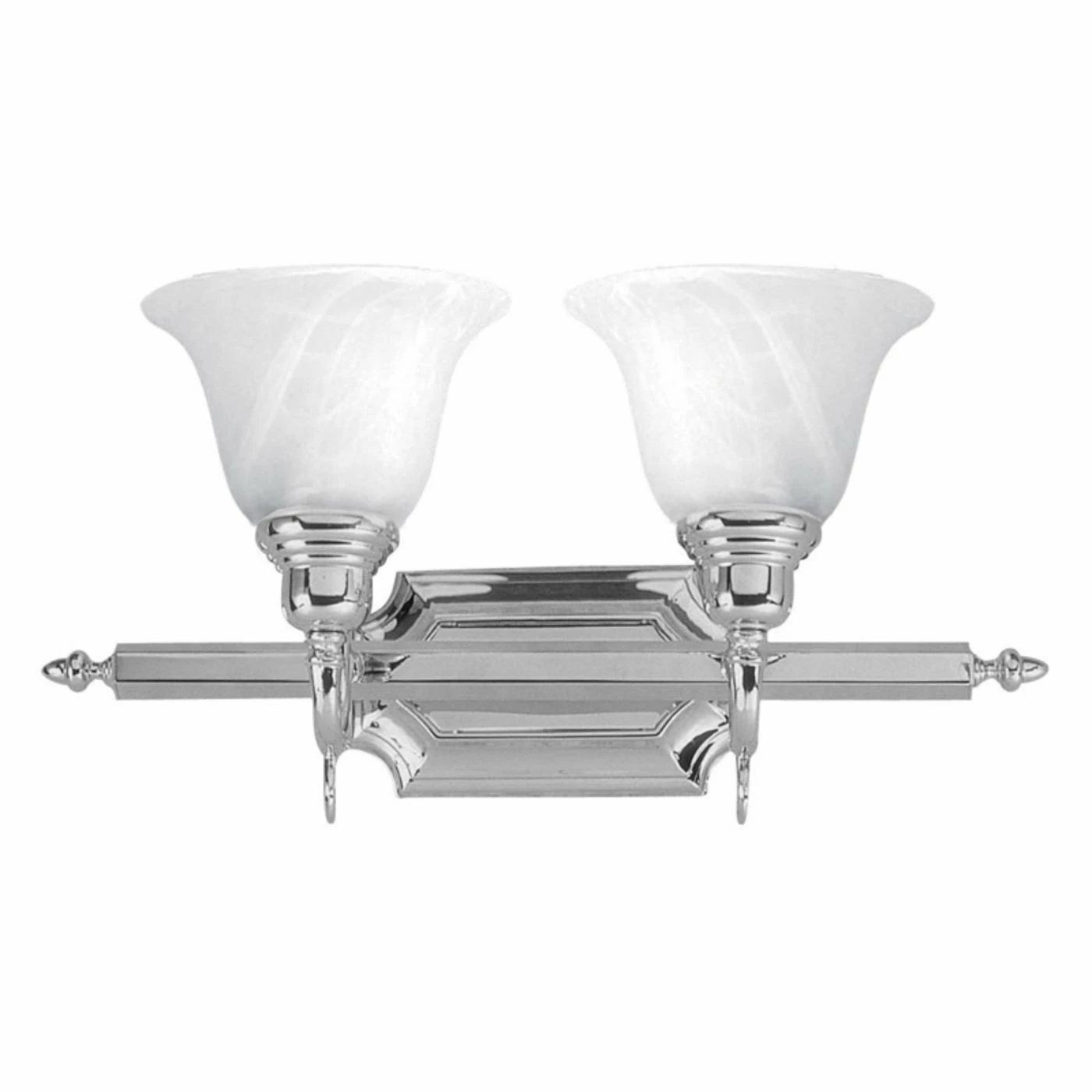 The Livex French Regency 1282 Vanity Light – 19W in. just might be the tres parfait solution that takes your bathroom from drab to dazzling. After all, this vanity light is available in your choice of eye-catching finishes, while the shapely backplate, classic crossbar, and subtle scrollwork is modeled after traditional French design. Last but certainly not least, the two bell-shaped shades are made of white alabaster glass to help diffuse and soften the light. Youβll need to add two 100-watt medium base bulbs (not included).