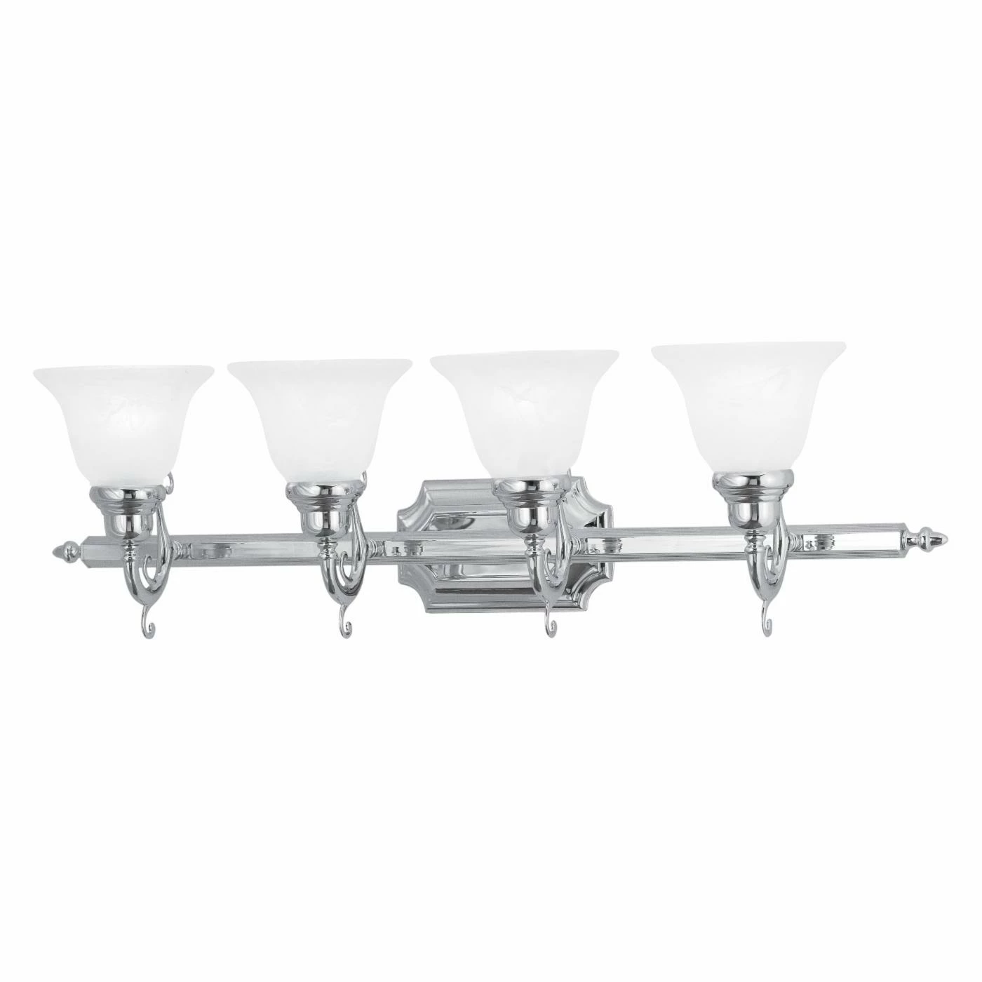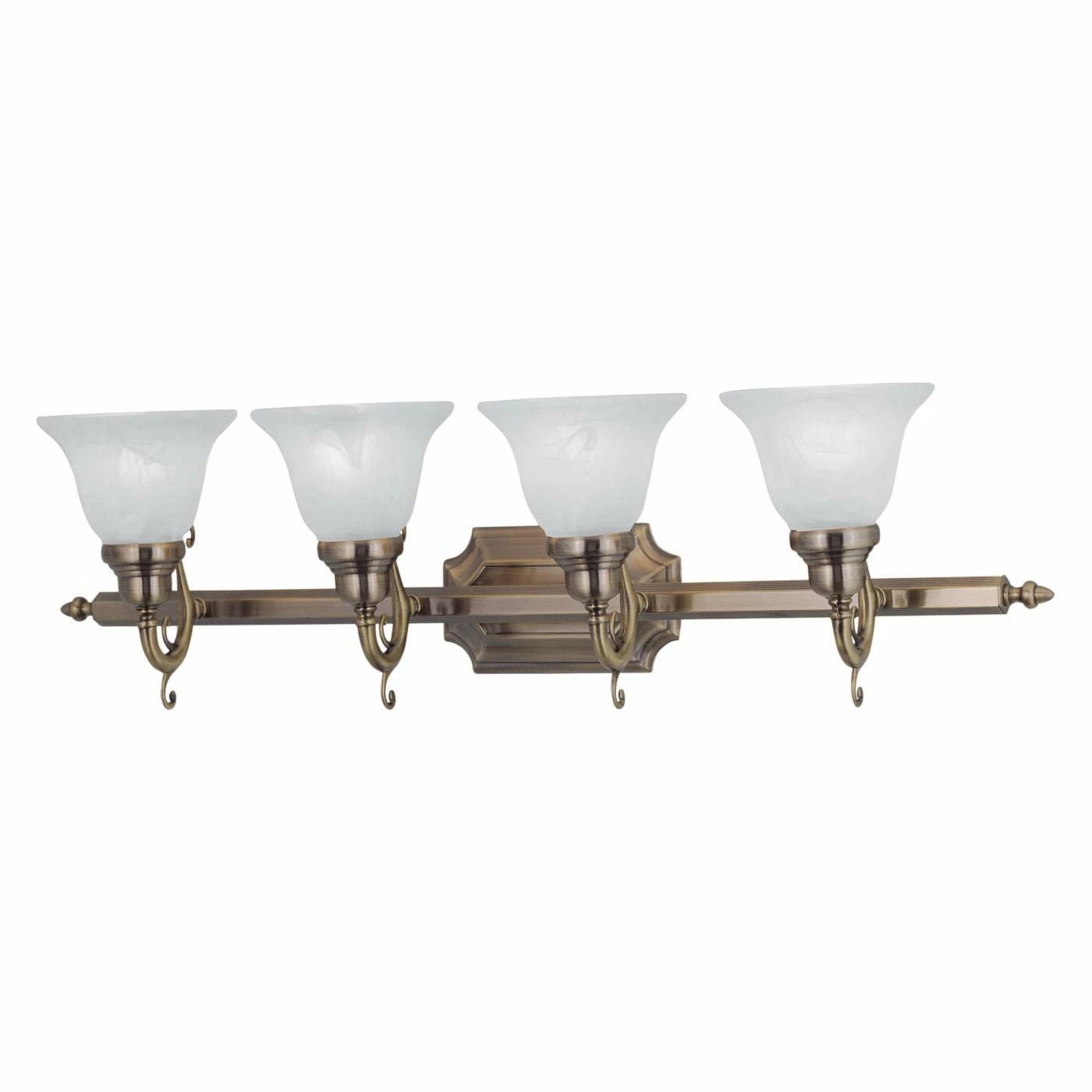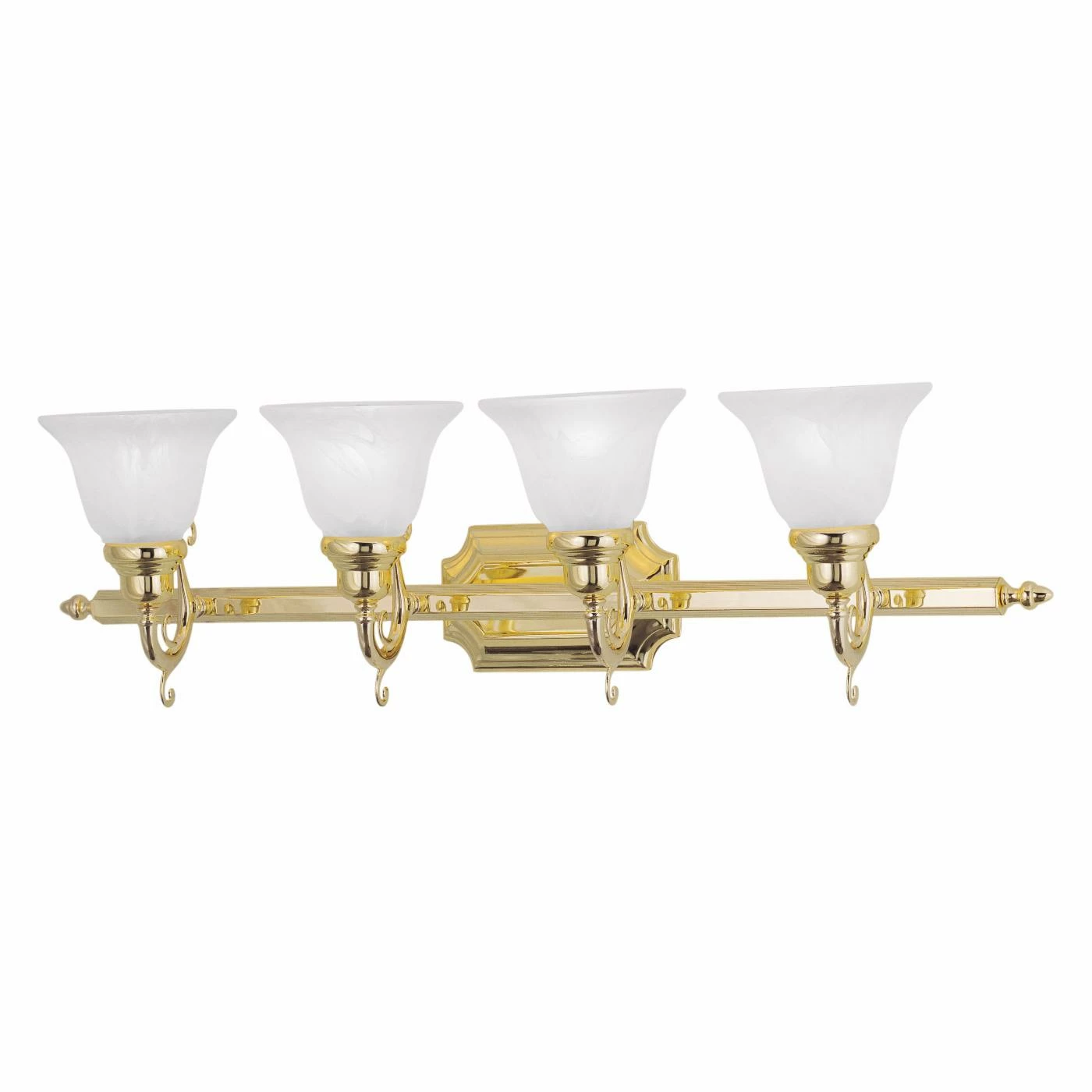 Four lights, each housed within classic bell shades, make the Livex French Regency 1284 Bath Vanity – 33W in. a bright addition to your bath. A straight support with flourishing arms makes for a fetching design.