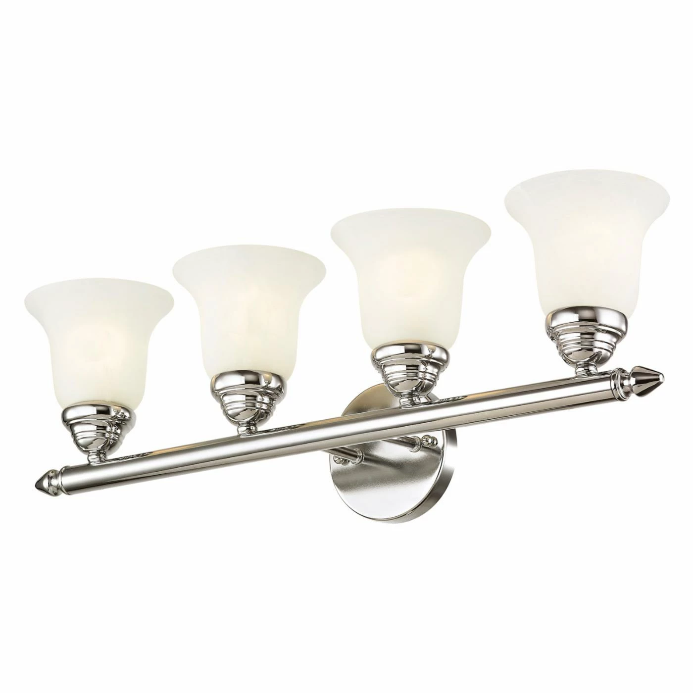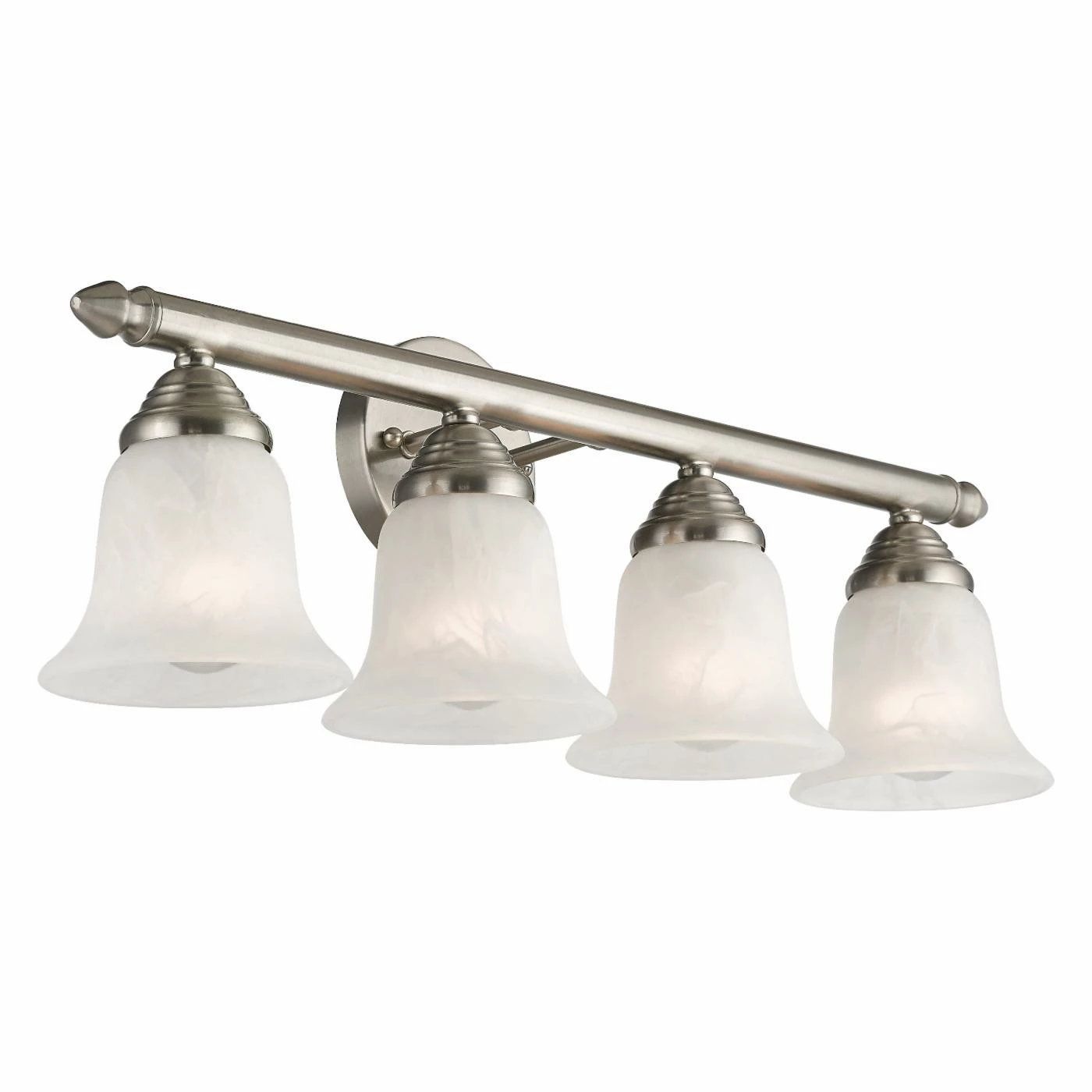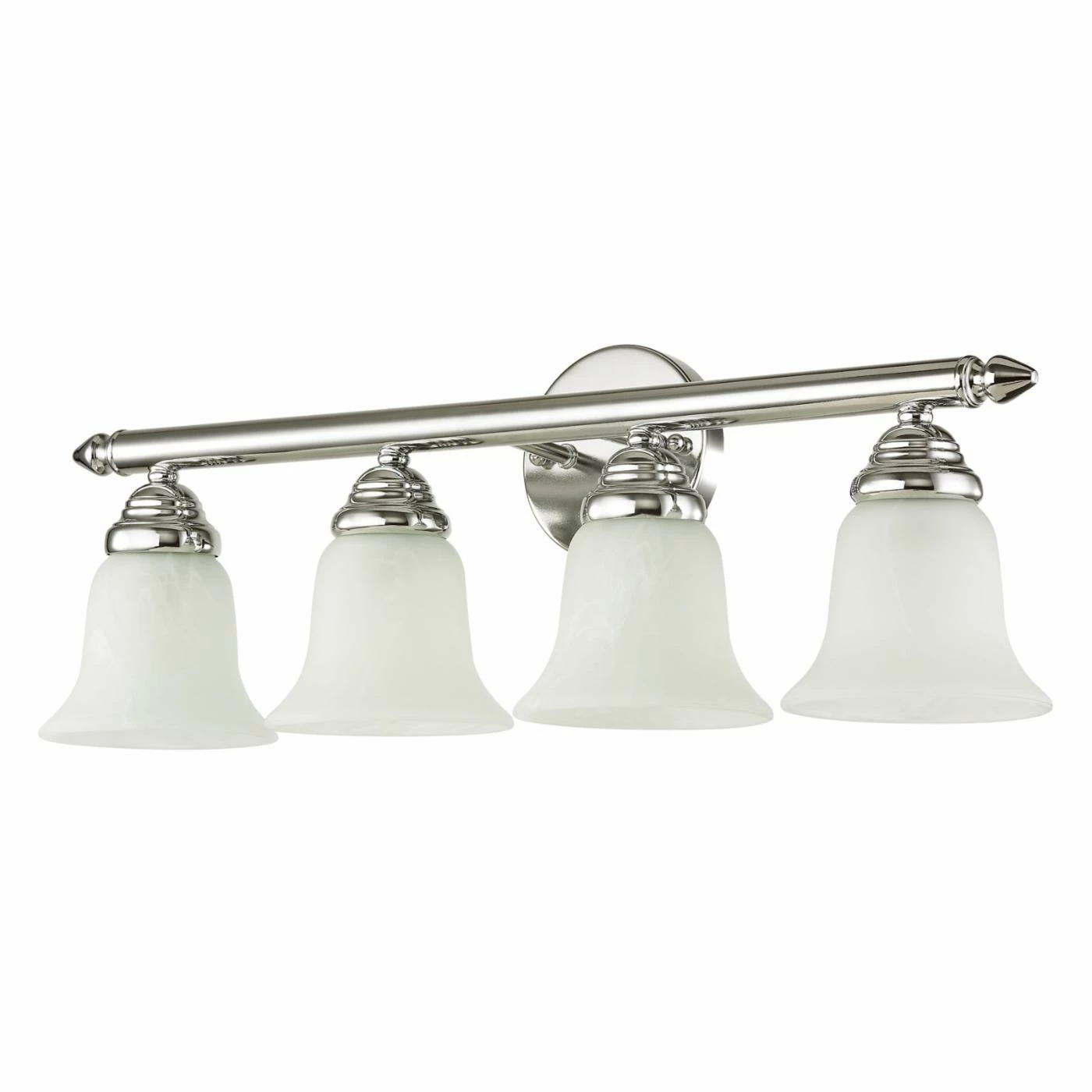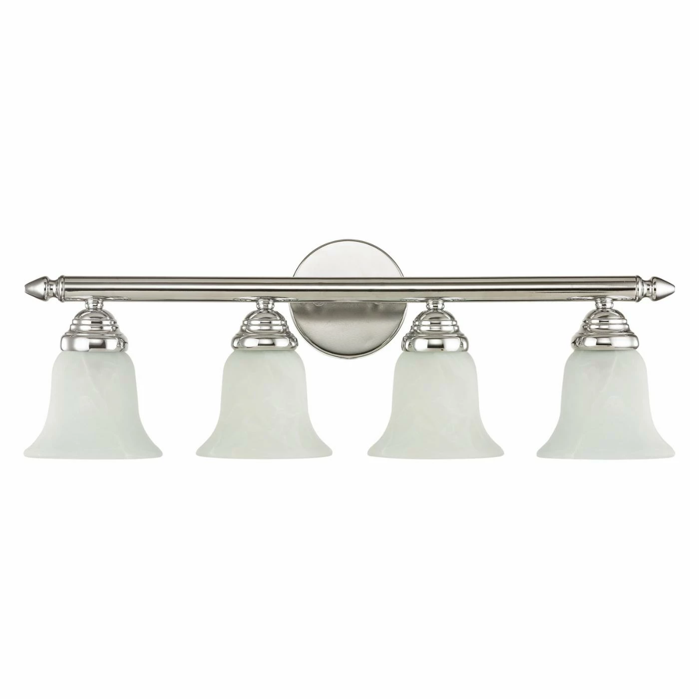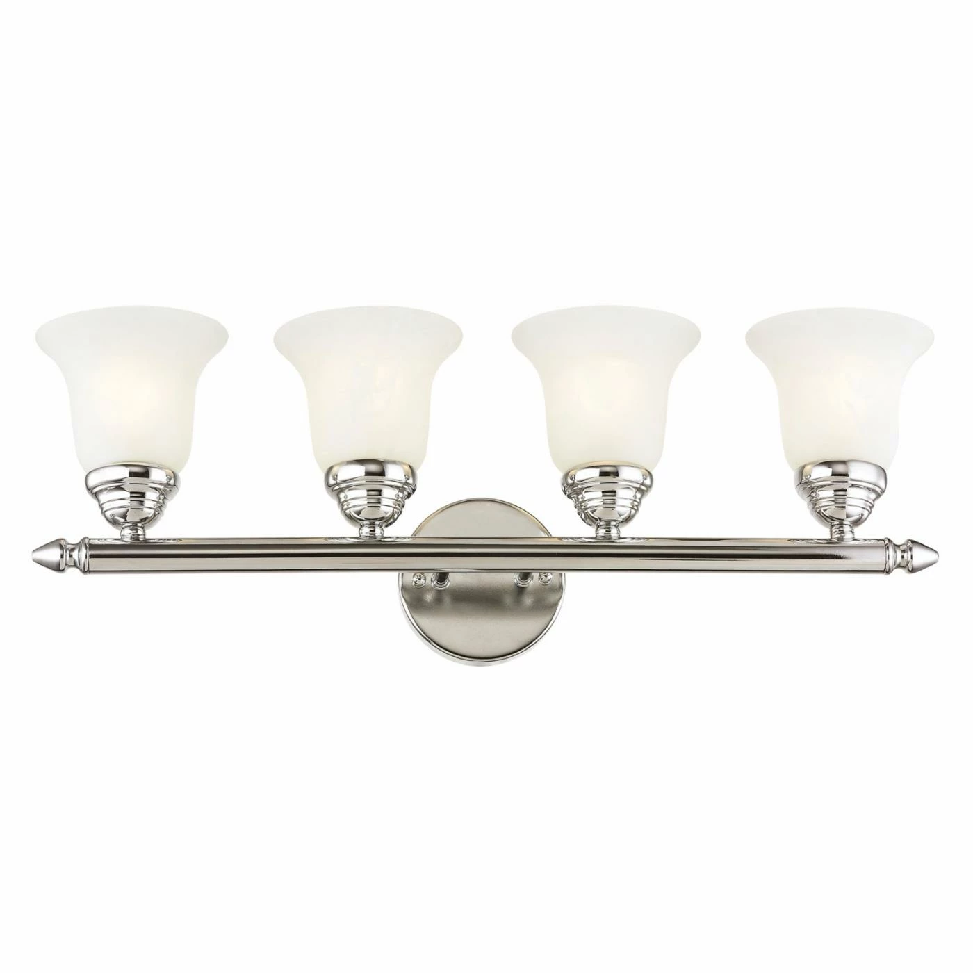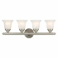 Lucky you – the Livex Home Basics 1064 Vanity Light – 24W in. looks lovely in practically any bathroom. With a simple, savvy aesthetic, this vanity fixture is sure to get your toothbrushes talking thanks to its classic crossbar design, circle backplate, and bell-shaped white alabaster glass shades, which are designed to diffuse the light. The fixture can be installed as a downlight or an uplight, and itβs available in an array of eye-catching finishes – pick yours today. Requires four 100-watt medium base bulbs, not included.