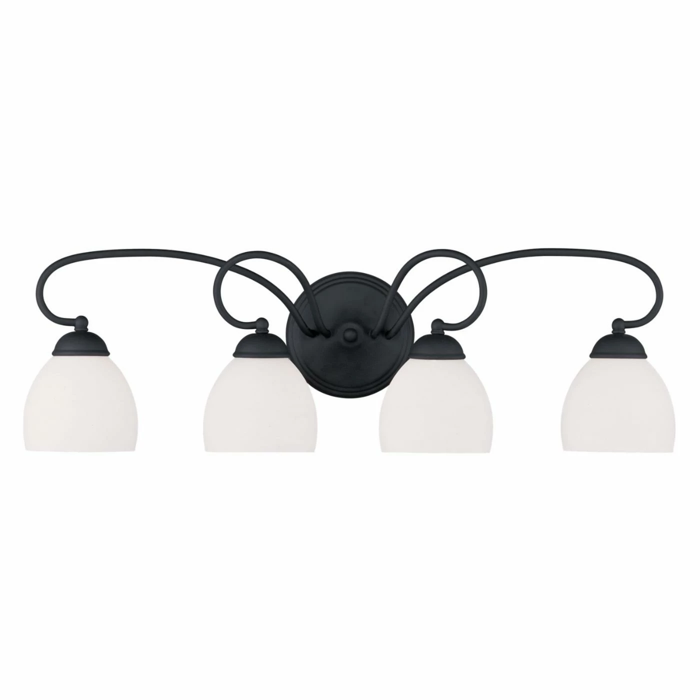 Youβll love the design of the Livex Brookside 4754-04 4-Light Bath Light in Black – its slender curved arms, black finish, and round backplate all combine to provide a look thatβs luxurious in any loo. Four hand-blown satin white glass shades complete this easily elegant style. Requires four 100-watt medium base bulbs (not included).