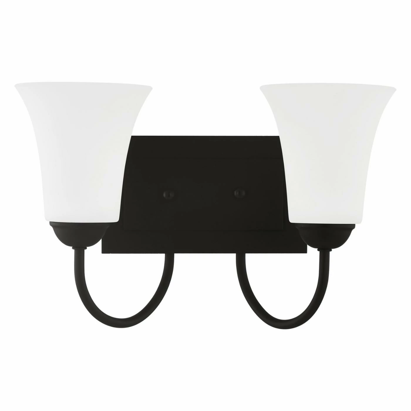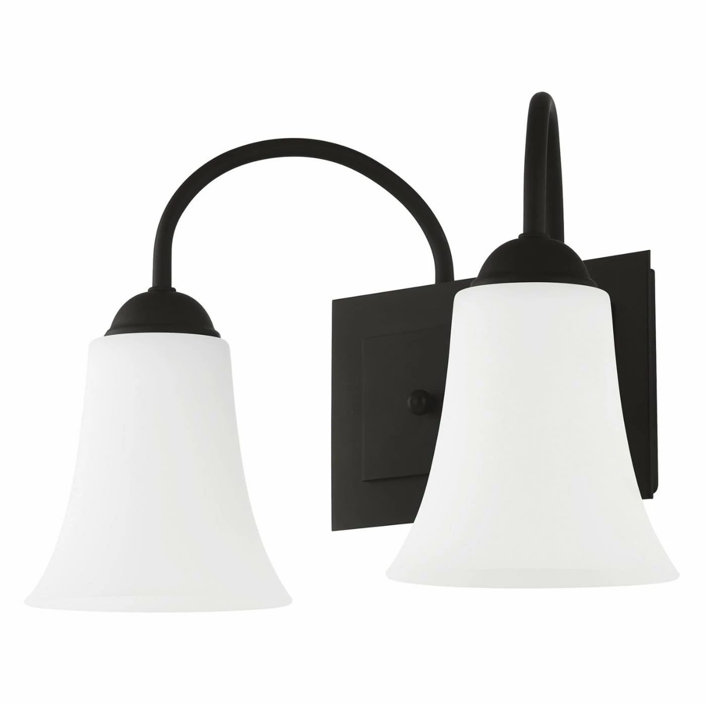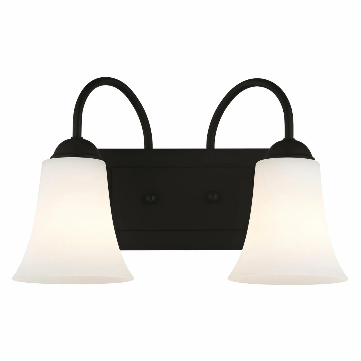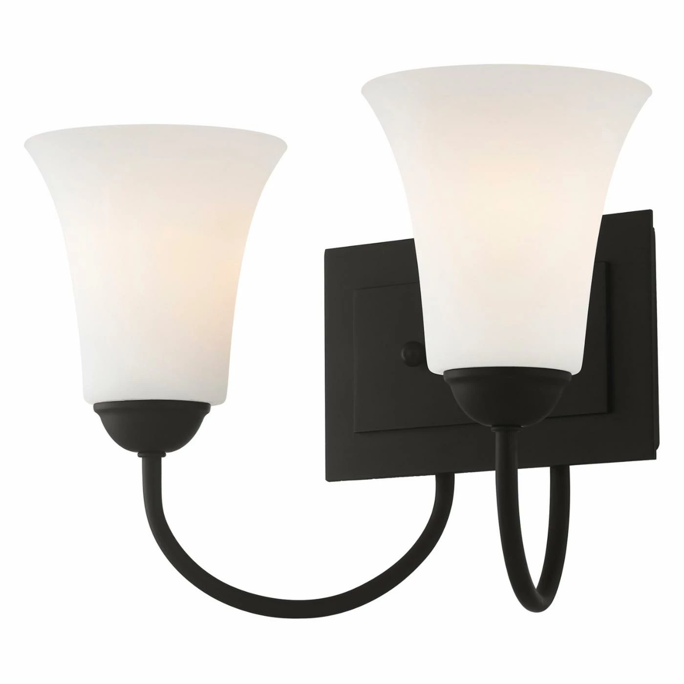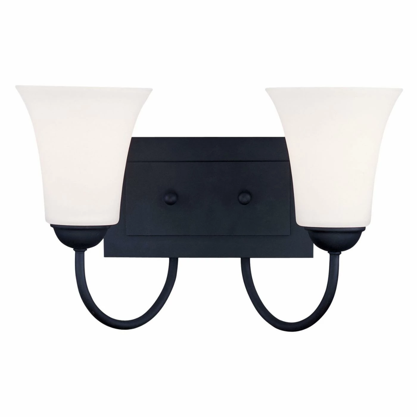 Youβll be glad you chose the Livex Ridgedale 6482-04 2-Light Bath Light in Black – its transitional charm adds luxe to any loo. The big rectangular backplate and slender arms have an easy elegance with their black finish, and the two lights each have a hand-blown satin white glass shade. Requires two 100-watt medium base bulbs (not included).