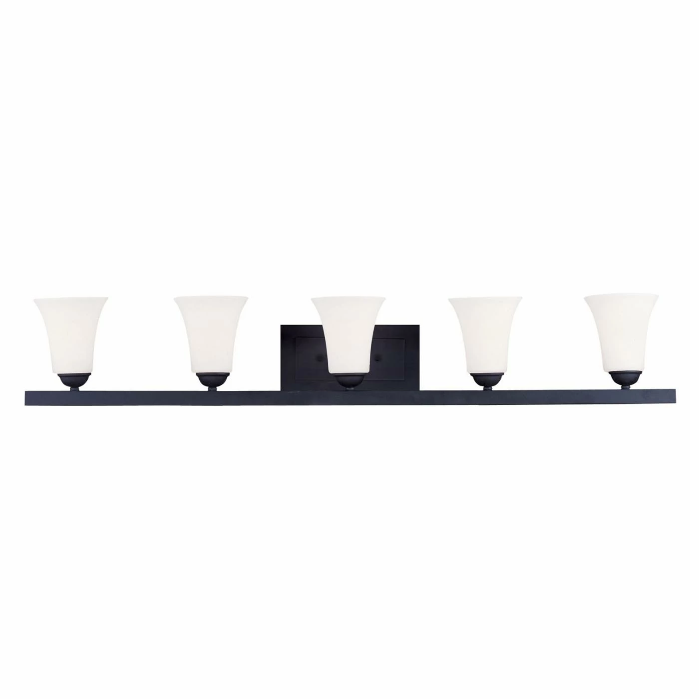 If youβve got a big, bold mirror in your bath space, it needs a big, bold companion like the Livex Ridgedale 6485-04 5-Light Bath Light In Black. Inspired by the transitional design aesthetic, this bath light has a black finish that draws attention to the rectangular backplate, solid crossbar, and hand-blown satin white glass shades. Youβll need to add five 100-watt medium base bulbs.