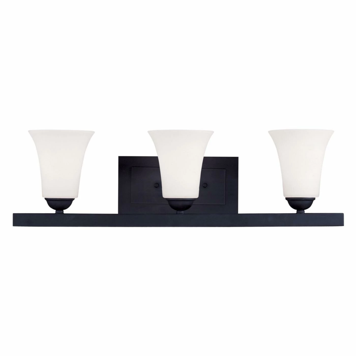 Enough with the flighty, fussy vanity lights – the Livex Ridgedale 6493-04 3-Light Bath Light in Black has a bold presence you (and your bath space) will appreciate. The black finish highlights the rectangular backplate and thick crossbar, while the three shades are made out of hand-blown satin white glass. Youβll need to add three 100-watt medium base bulbs.