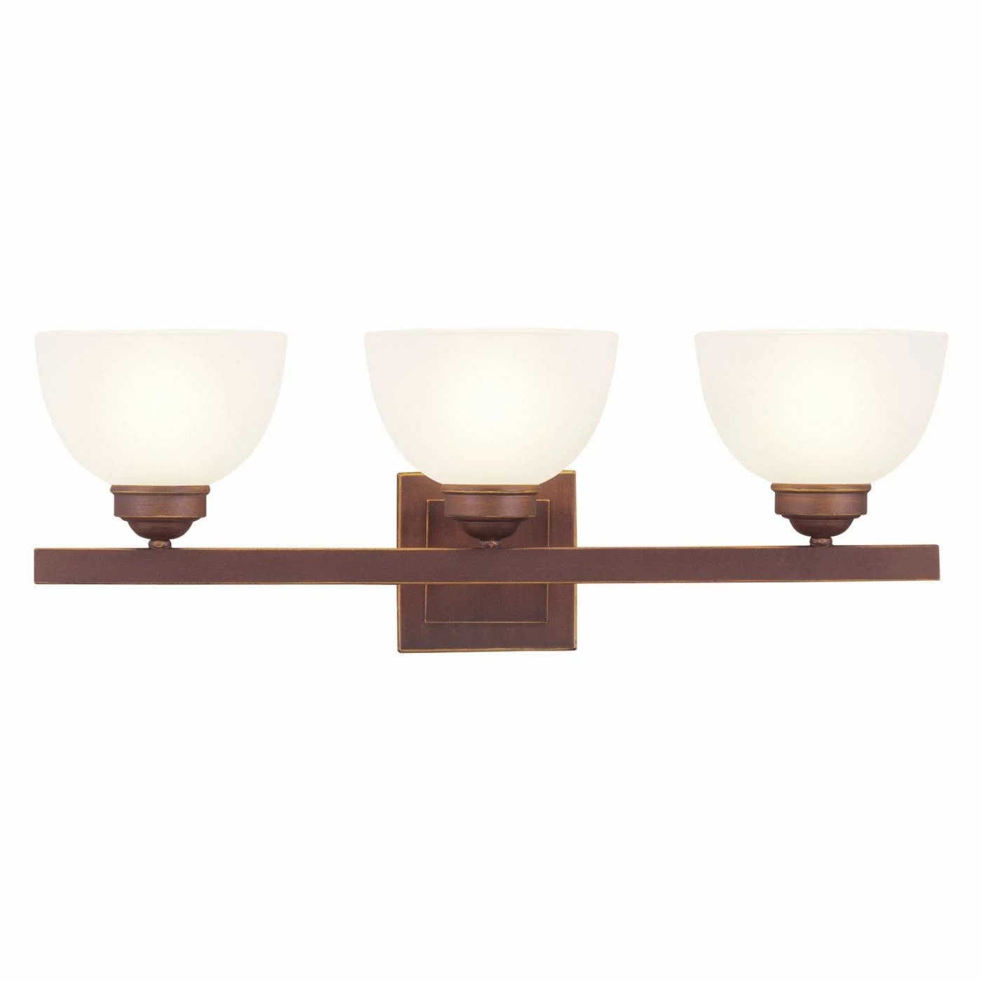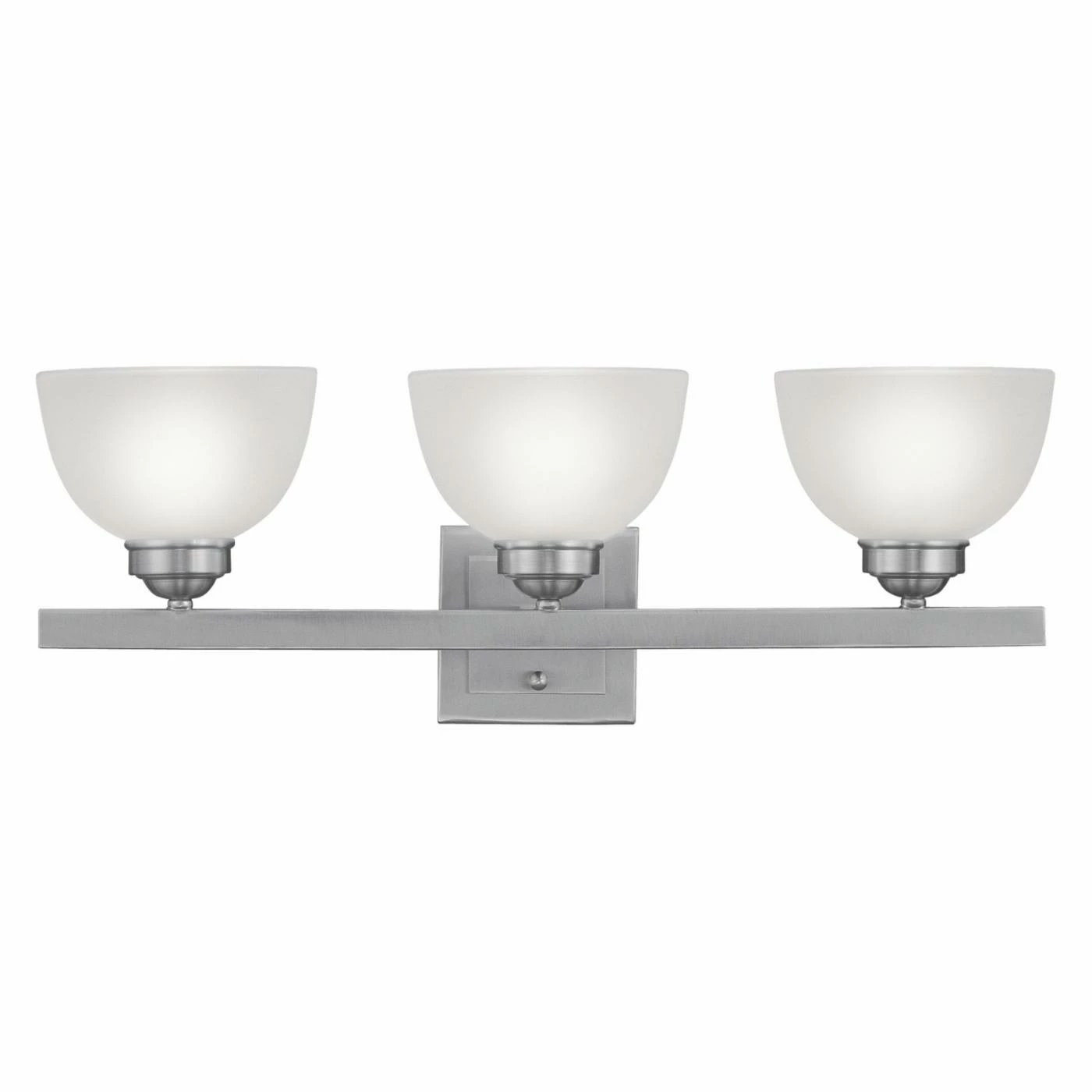 Three bowl shades with a frosted finish make the Livex Somerset 4203 Bath Vanity – 24.75W in. a soft and stylish addition to your bathroom. This fixture boasts a square backplate and linear support in your choice of available finish option.
