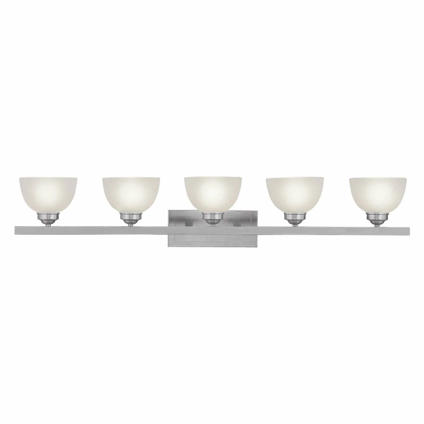 Make your bathroom a sophisticated reflection of your modern home with the Livex Somerset 4205 Bath Vanity – 48W in.. This long fixture offers straight style lines in contrast to the gentle curve of the frosted glass shades.