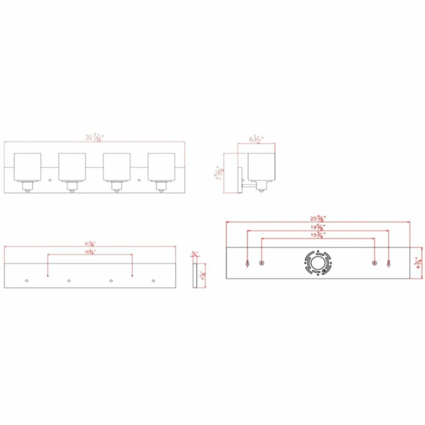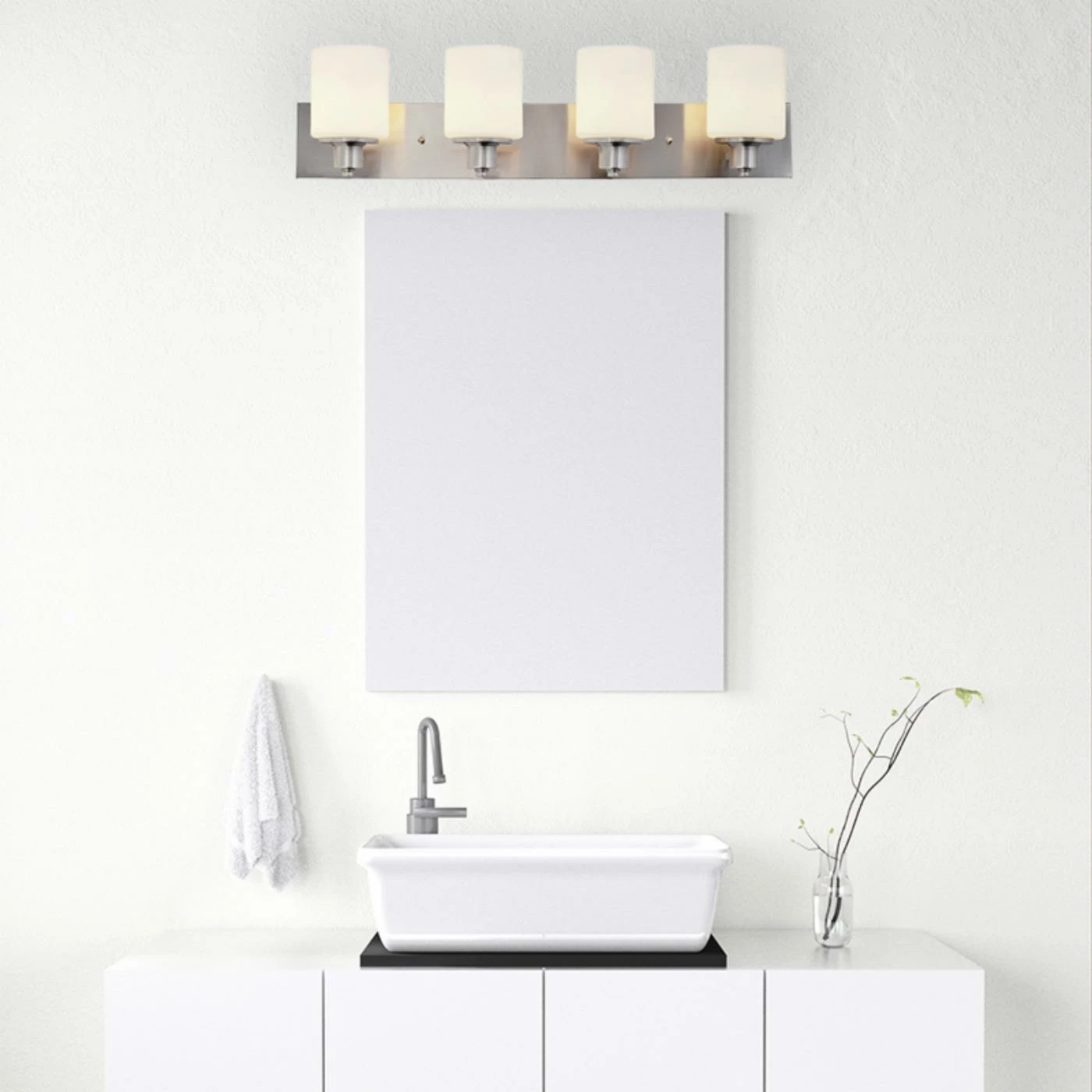 For designer versatility, you can mount the Design House Dane 578849 Bathroom Vanity Light as an uplight or downlight. Either way its four cylindrical frosted white glass shades are sure to bathe your space with light. This bath vanity light requires four 60-watt incandescent bulbs (not included).
