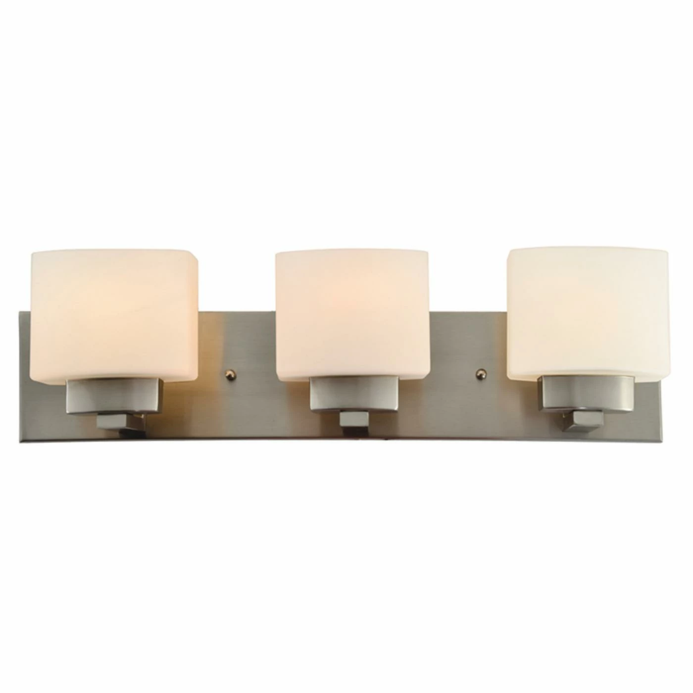 Frosted white glass shades and a satin nickel finish give the Design House Dove Creek 578005 Bathroom Vanity Light its contemporary appeal. This bath vanity light fixture is suitable for mounting up or down, giving your designer control. It requires three 60-watt incandescent bulbs (not included).