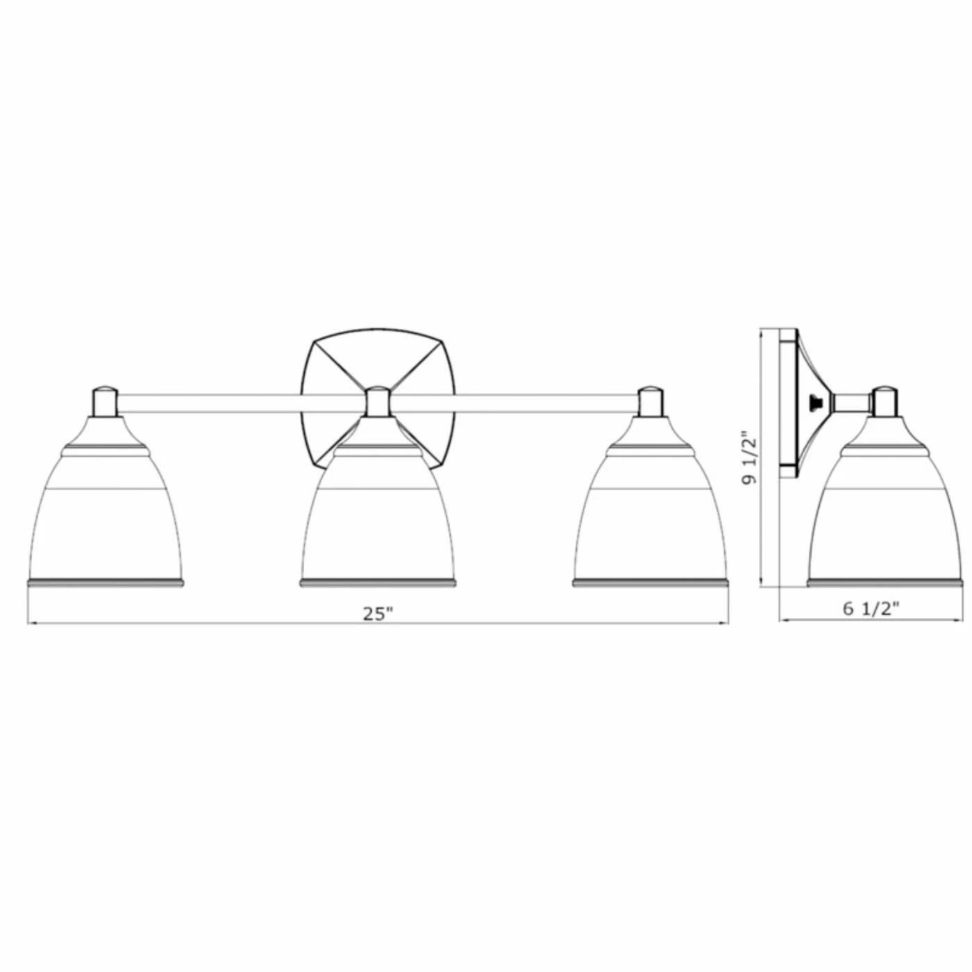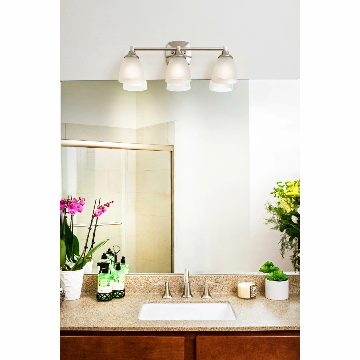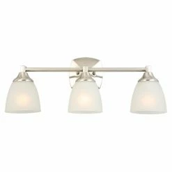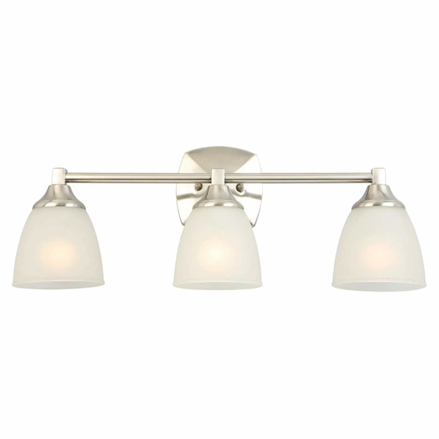 Frosted white bell shades direct light down to ensure the Design House Perth 578336 Bathroom Vanity Light will bathe your space with light. A satin nickel finish adds a contemporary gleam to this bath vanity light. It requires three 60-watt incandescent bulbs (not included).