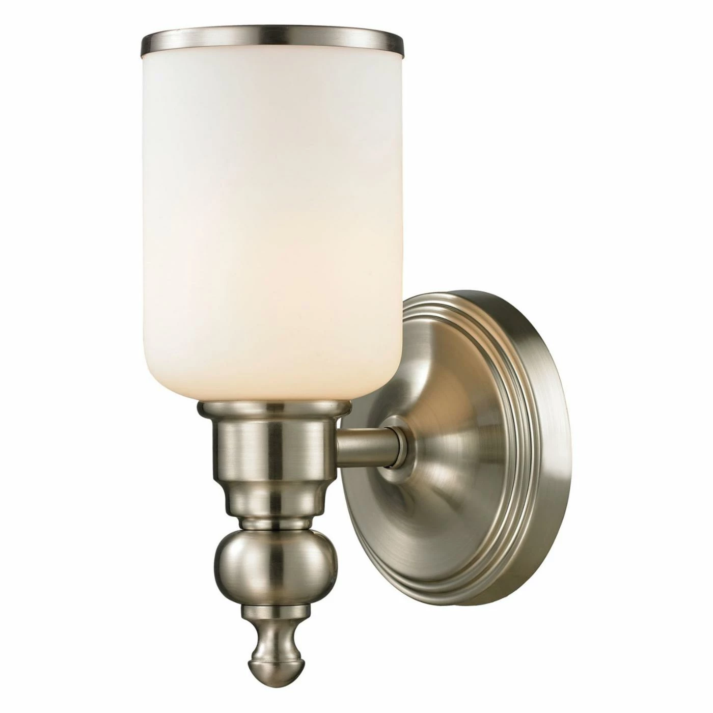 The classic look of the ELK Lighting Bristol Way 1 Light Bathroom Vanity Light brings elegance to your bathroom. The metal housing features a turned base for a dressed-up look, while the white glass shade features a coordinating metal rim. This vanity light is offered in your choice of available finishes, and it requires one bulb. The bulb comes included with the LED option. Bulb sold separately in other options.