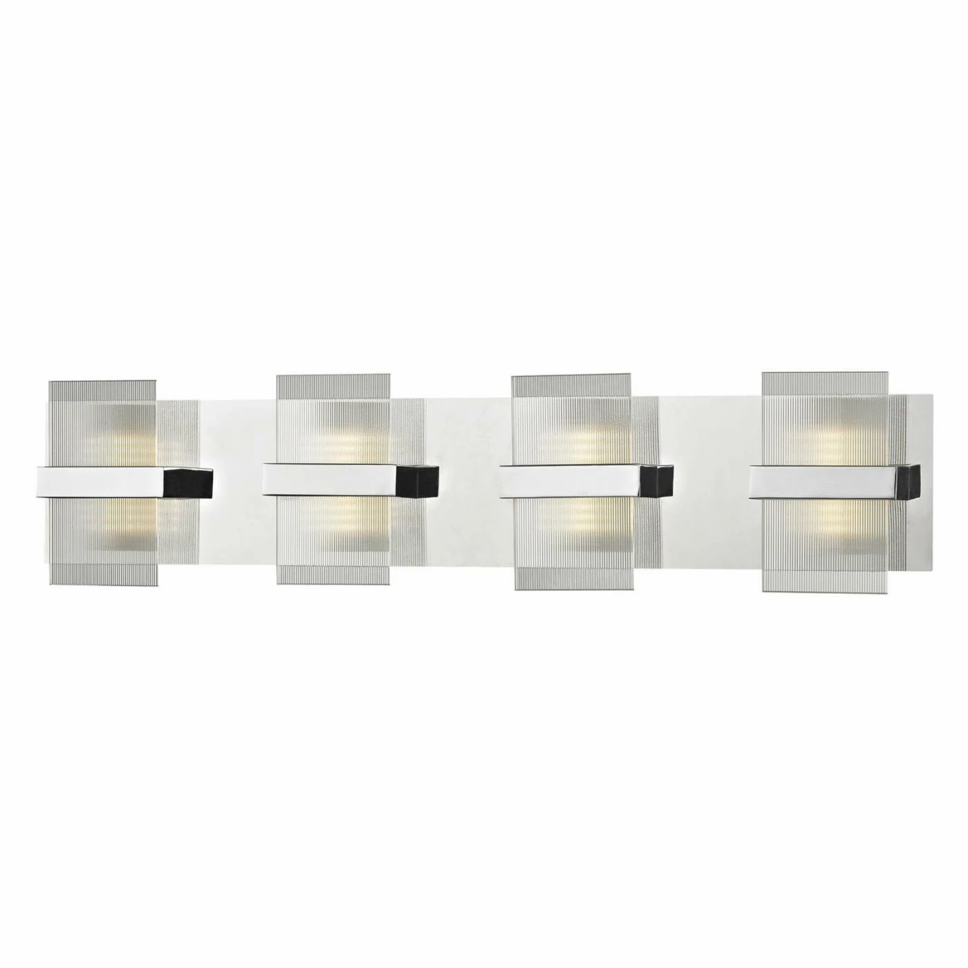 Four clear glass shades with a ribbed look bring sleek, modern appeal to the ELK Lighting Desiree 81142/LED Bathroom Vanity Light. A sturdy metal frame with a polished chrome finish extends to band around each shade, adding a gleaming shine to your decor.