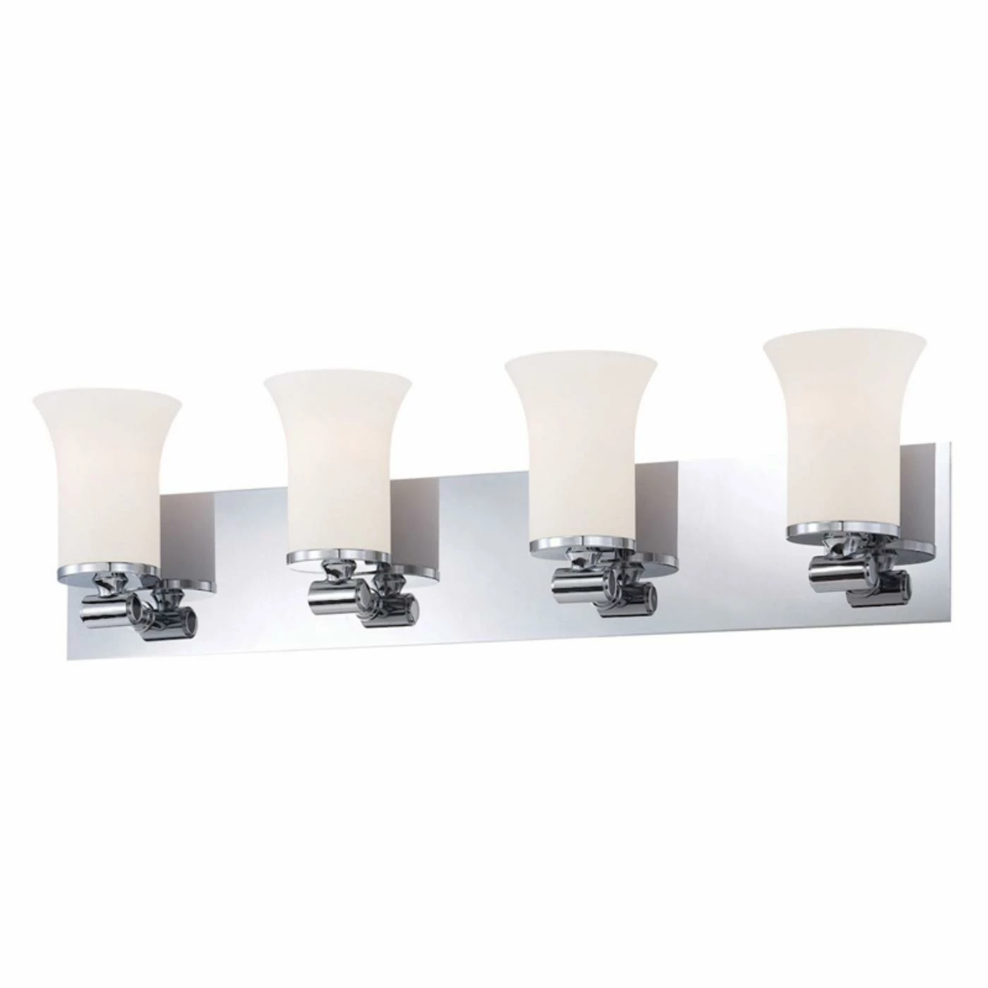 Finish your modern bathroom in a snap with the simple elegance of the ELK Lighting Flare 4 Light Bathroom Vanity Light. A streamlined metal housing features a shiny chrome finish. The white glass shades filter the light, creating a soft glow. This vanity light requires four 100-watt bulbs (not included).