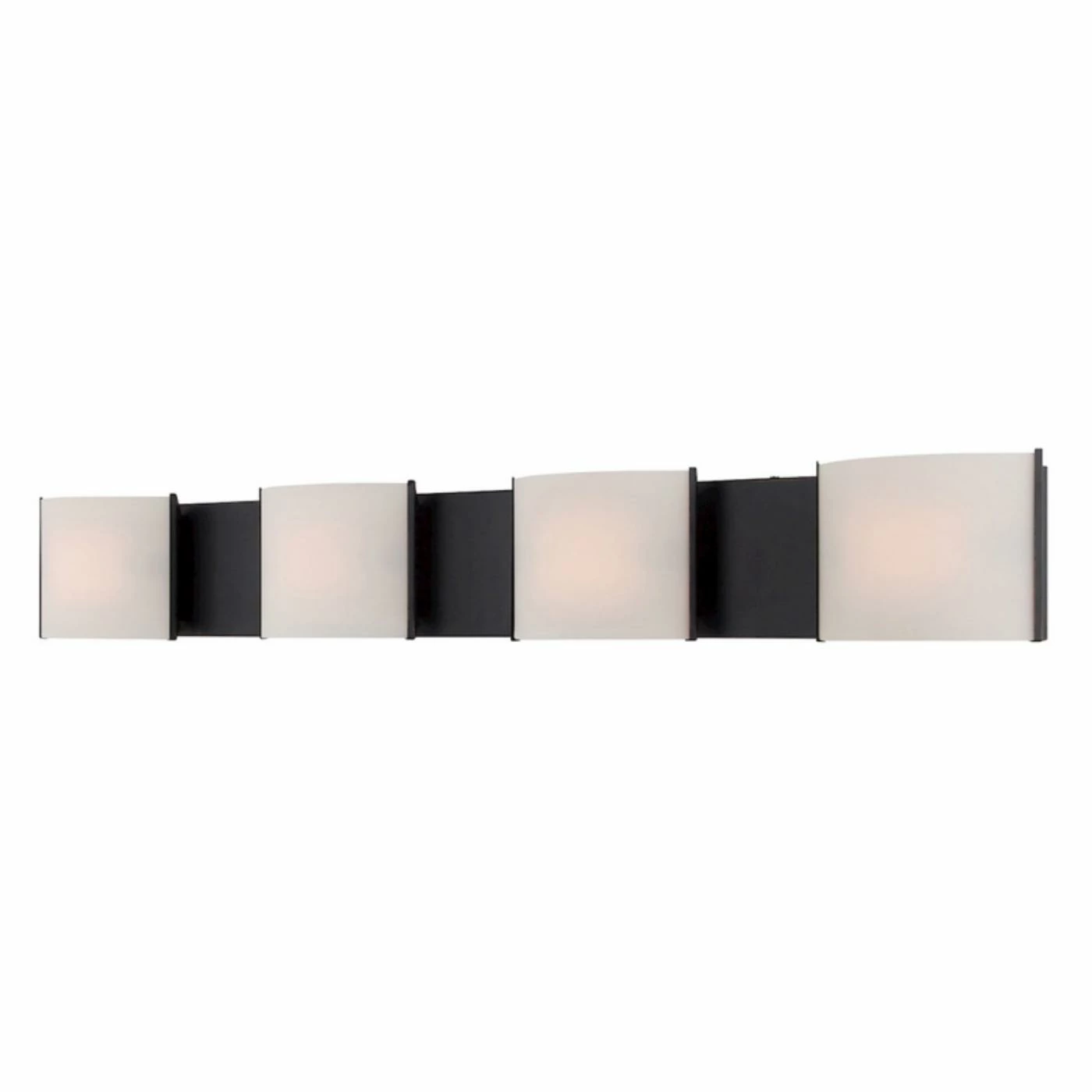 The contemporary style of the ELK Lighting Pandora Tall 4 Light Bathroom Vanity Light adds a striking touch to your bathroom. A metal housing beautifully complements the white glass shade, creating striking contrast. Choose from the available finishes to achieve the look that best suits your space. This vanity light requires four 100-watt linear halogen bulbs (not included).