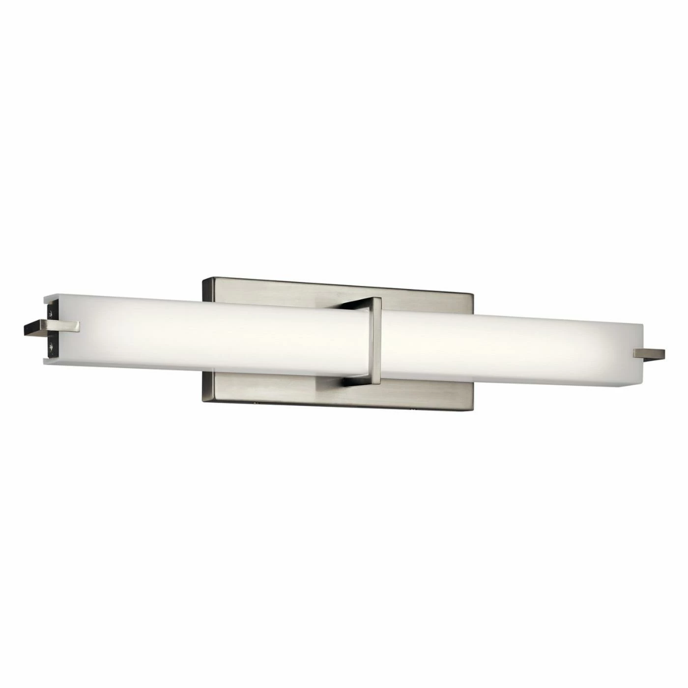 Edgy detail at the base adds modern industrial charm to the Kichler 11146 Linear Bath Light. The plastic framework boasts an elegant brushed nickel finish and the white polycarbonate shade keeps light gently diffused, but still bright and clean-feeling.