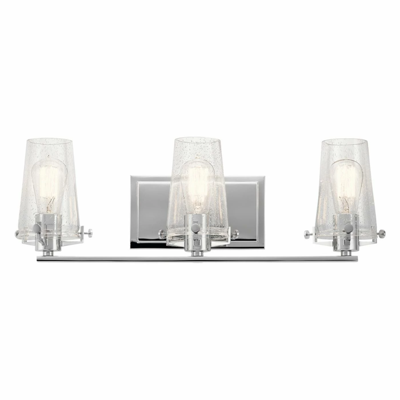 Finish the look of a bathroom, hallway, or other living space with industrial flair, complements of the Kichler Alton 45297 Wall Sconce. This three-lamp up light shows off edgy exposed screws and clean, simple lines with a horizontal bar arm and a stepped rectangular back plate. Tapered, seeded glass shades glisten in the light and are transparent, making the fixture ideal for decorative antique-style bulbs. You can choose your preferred finish from the available options.