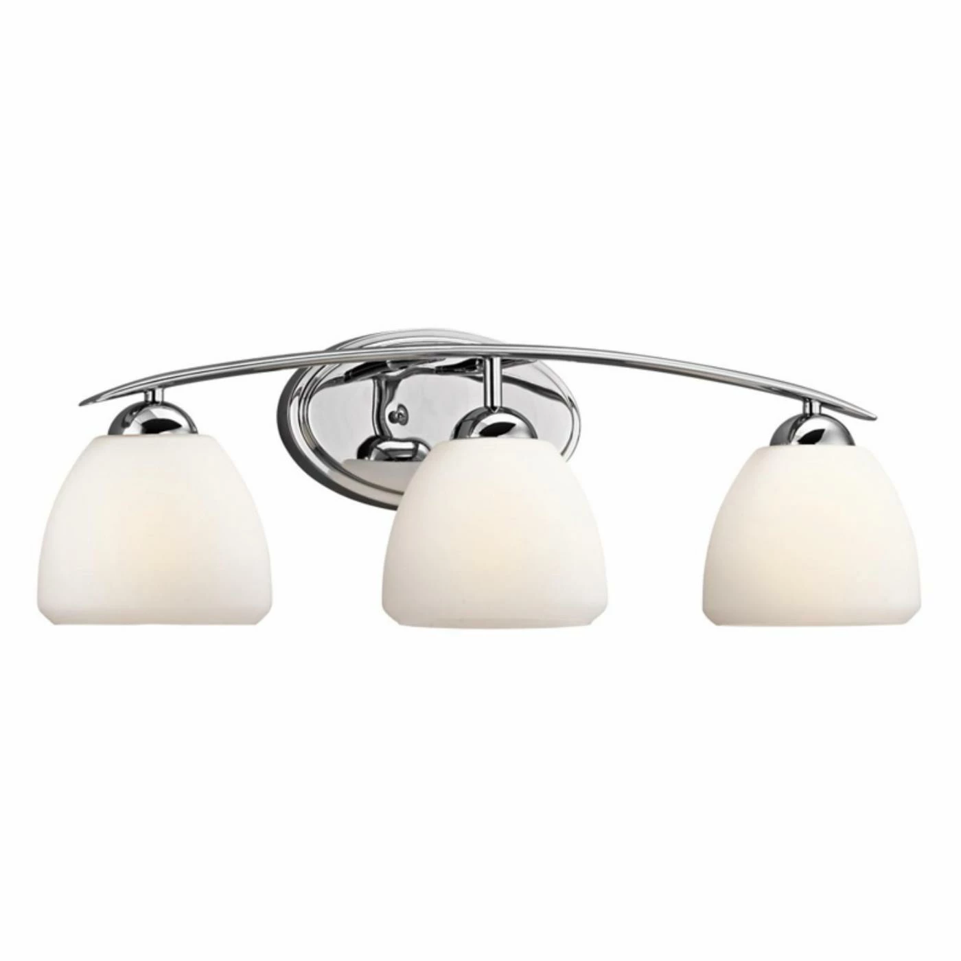 With three lamps, the Kichler Calleigh 45119 Vanity – 26 in. is ideal to light up your bathroom or vanity room. By installing it with its diffuser facing up or down, you can get an up-light or down-light effect. Available in various finish options, you can choose a color that suits your home decor. This light fixture features a steel construction that makes it strong and durable. Its conical opal-etched glass shades look good on the slightly curved arm.