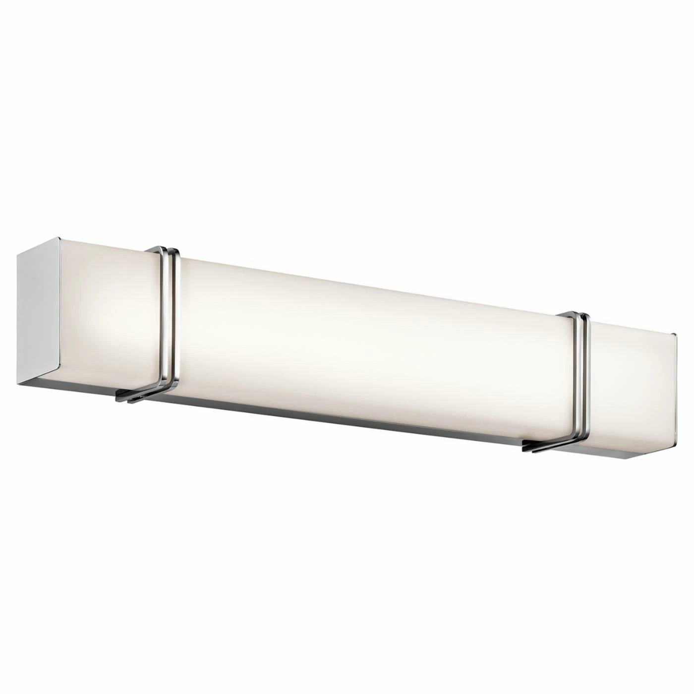 Brighten up your bathroom with this Kichler Impello 45839 Linear Bathroom Vanity Light. The elongated rectangular shape and subtle metallic bar accents underscore the contemporary motif. Includes one 30-watt bulb.