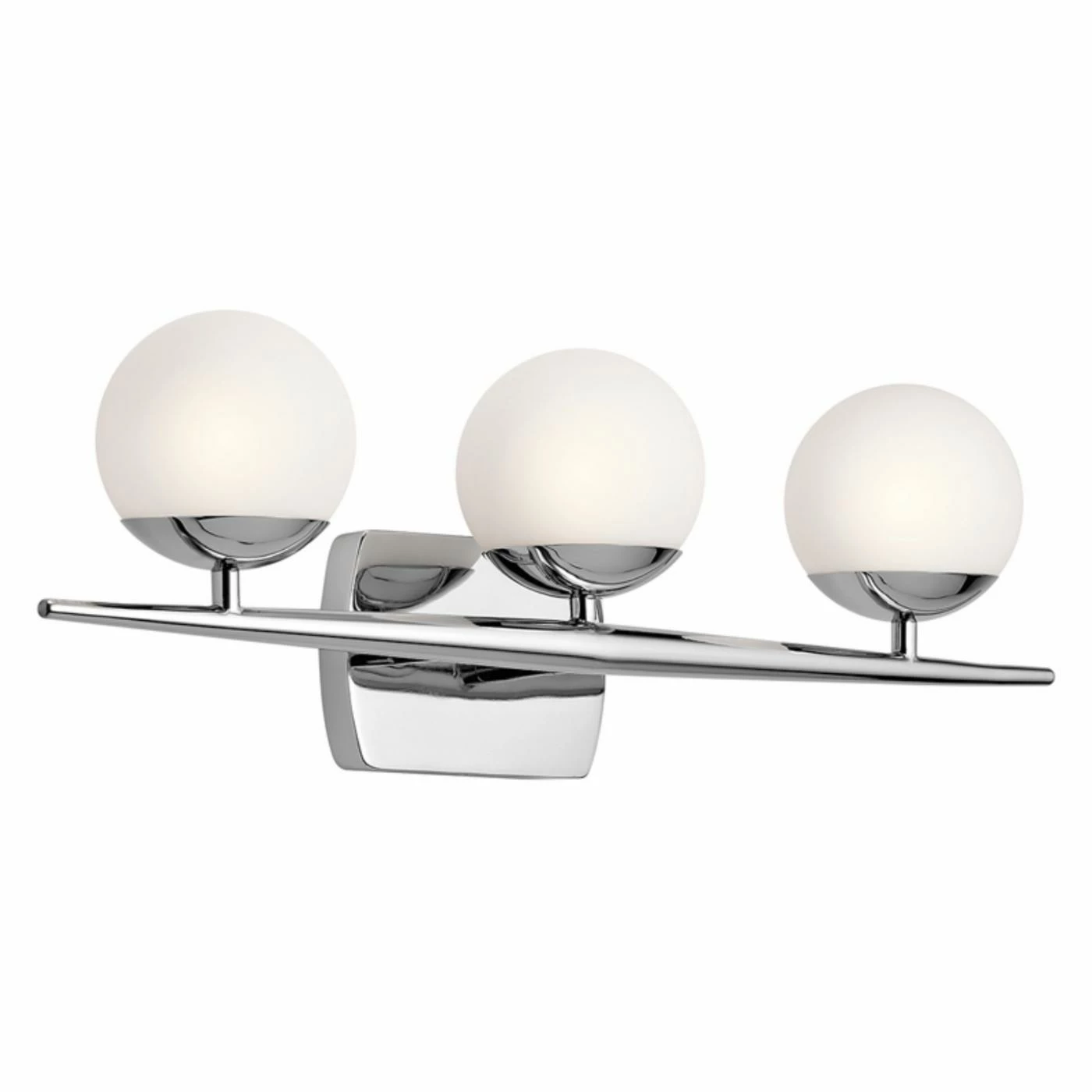Update your space with the Kichler Jasper 45582 3 Light Bathroom Vanity Light. This contemporary fixture combines elegance and a clean, streamlined design for a look that enhances any dΓ©cor. A white glass globe sits on a sleek arm in your choice of available finish. The round glass shade disperses light evenly throughout your space. This bathroom vanity light requires three 50-watt incandescent bulbs (included).