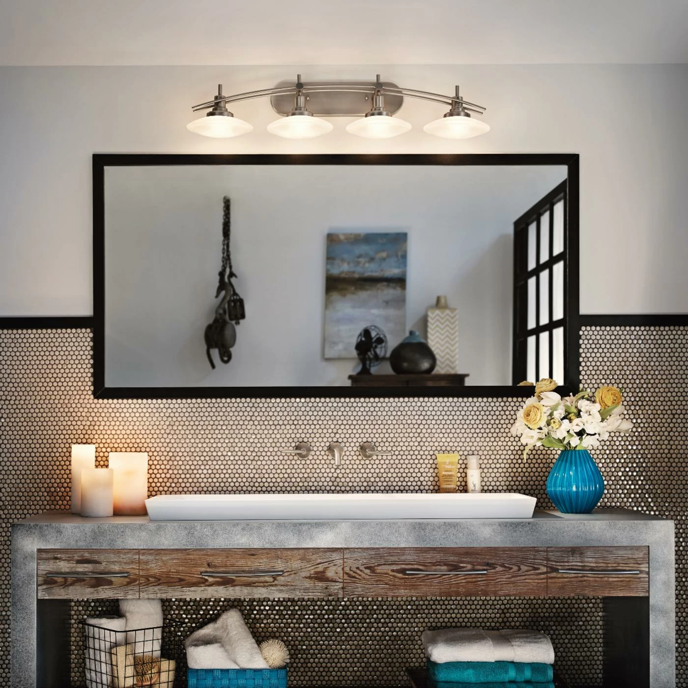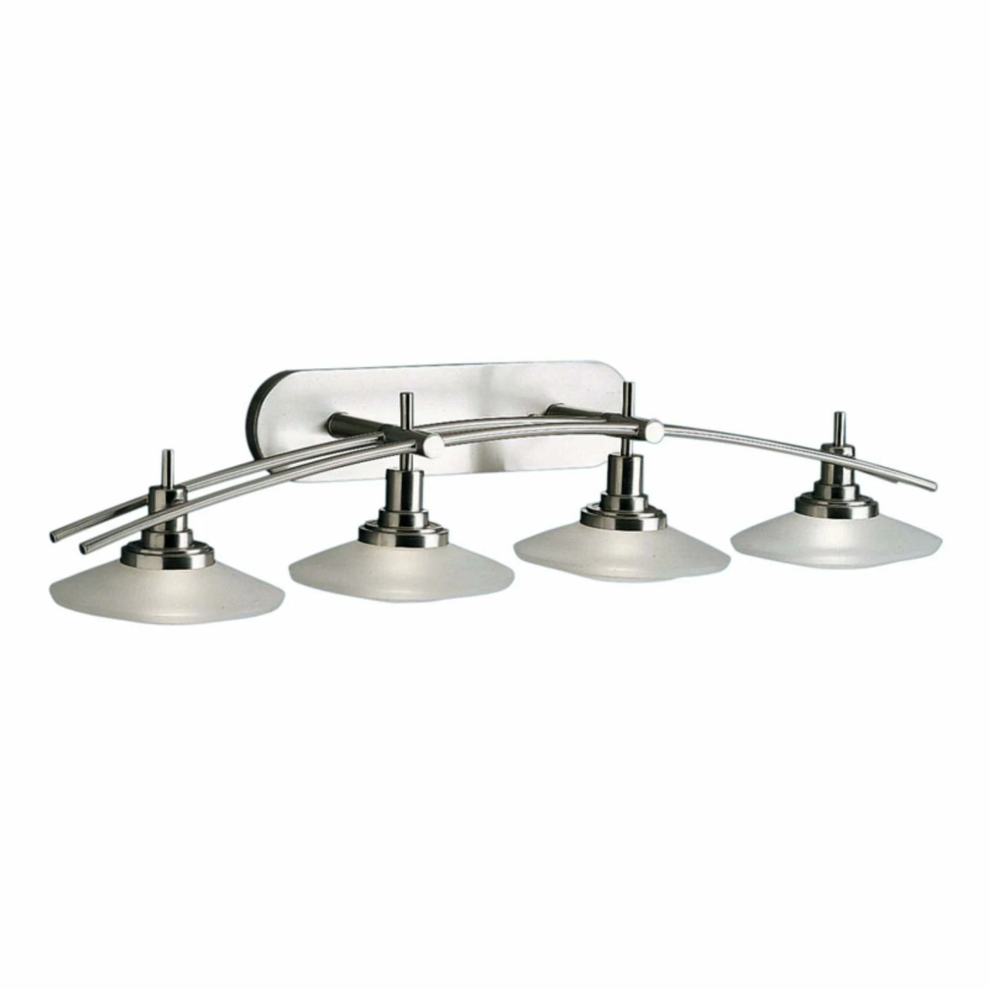 Illuminate your bathroom in a fresh and modern way with the Kichler Structures 6464 Bathroom Vanity Light. Four halogen bulbs housed within a satin etched shade are suspended from a curved support. Choose the finish that makes the best complement to your decor.