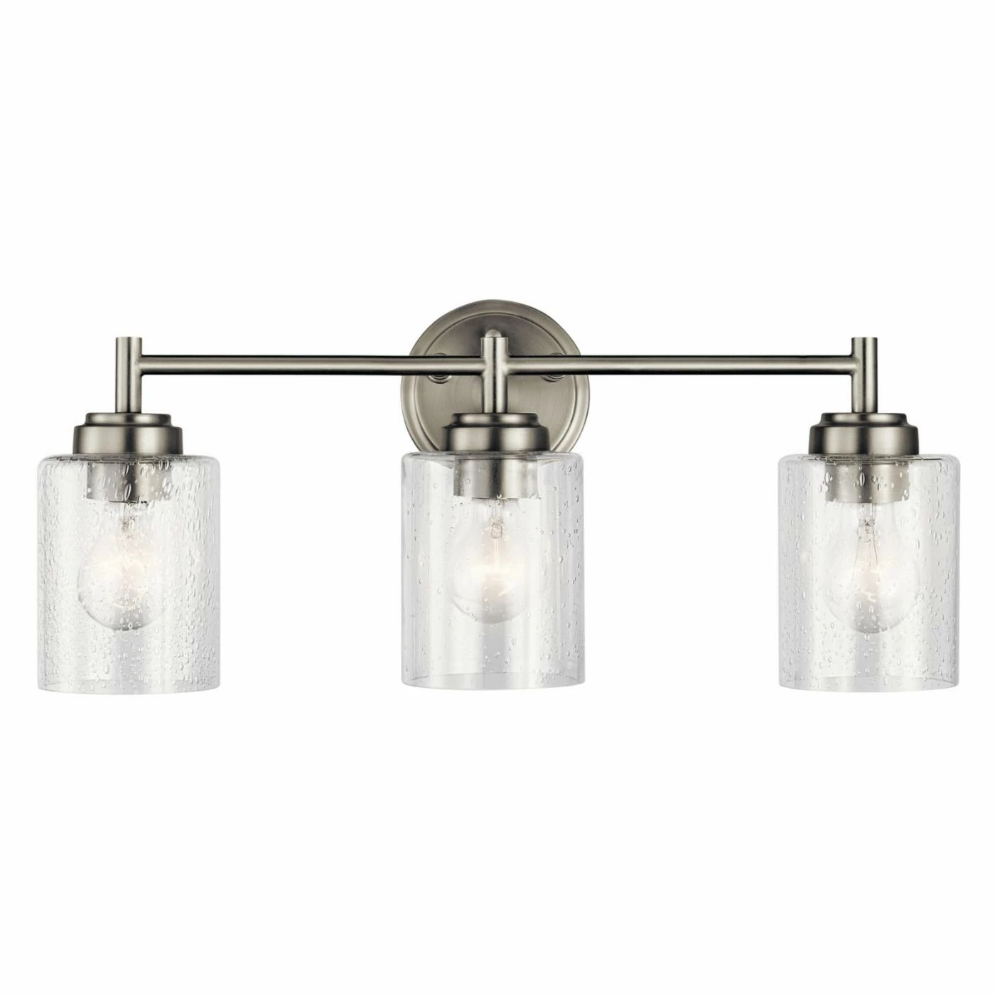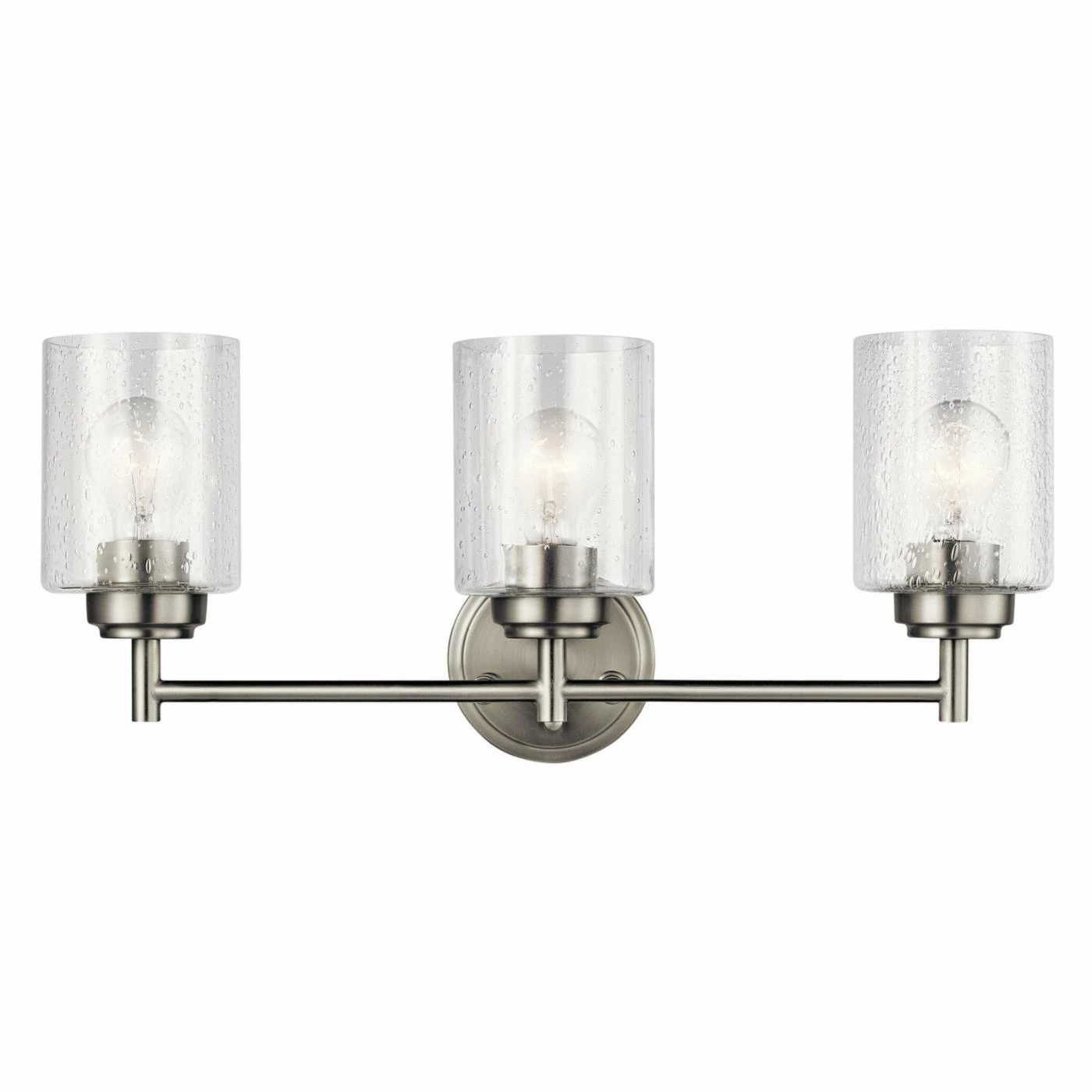Make any bathroom in your home a little more contemporary with the addition of the Kichler Winslow 45886 Bathroom Vanity Light. This chic, three-light fixture offers seeded glass shades that can be installed facing up or down.
