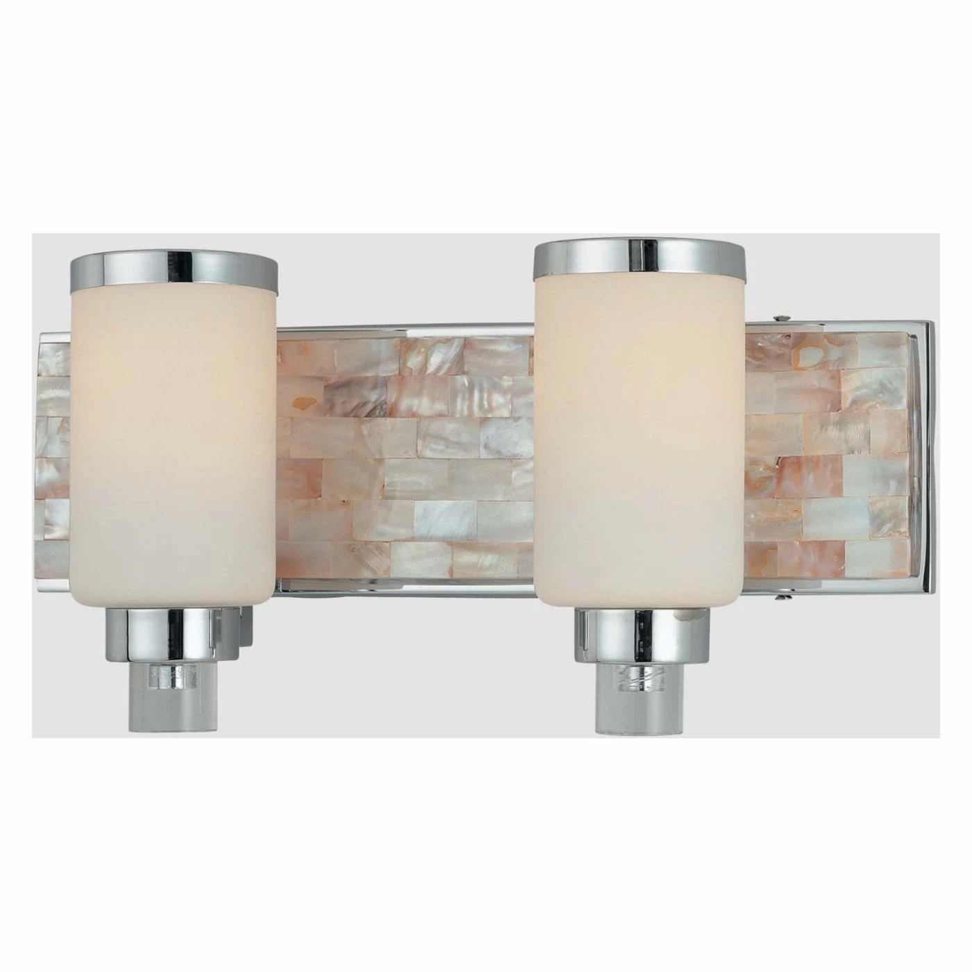 Shimmering shell mosaic tiles add earthly appeal to the Minka Lavery Cashelmara 3242-77 Bathroom Vanity Light, enhanced with two cylindrical white glass shades. Touches of chrome help to give this bathroom vanity light a contemporary twist you’ll appreciate in a powder room or guest bath.
